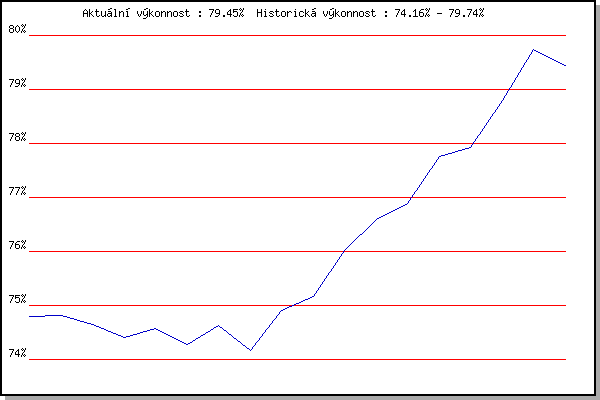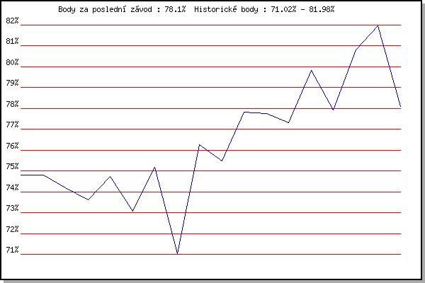 ZávodBodyVýkonnostZměna| 17.08.2011 | AC Moravská Slávia, 10km atletický | 74.80% | 74.80% | | | 24.08.2011 | Líšeň Mariánské údolí, 11.1 km | 74.81% | 74.81% | +0.01% | | 31.08.2011 | Popůvky, 7.9 km | 74.20% | 74.65% | -0.16% | | 07.09.2011 | Pisárky Anthropos, 6 km | 73.63% | 74.40% | -0.25% | | 14.09.2011 | Líšeň Mariánské údolí, 11.1 km | 74.73% | 74.58% | +0.18% | | 21.09.2011 | AC Moravská Slávia Brno, 1hod atlet | 73.06% | 74.27% | -0.31% | | 23.05.2012 | Obřany, 8.8 km | 75.18% | 74.64% | +0.37% | | 06.06.2012 | Popůvky, 7.9 km | 71.02% | 74.16% | -0.48% | | 13.06.2012 | Pisárky Anthropos, 6 km | 76.25% | 74.91% | +0.75% | | 20.06.2012 | Palackého vrch – Běh Olympijského dne | 75.49% | 75.17% | +0.26% | | 27.06.2012 | Obřany, 8.8 km | 77.83% | 76.01% | +0.84% | | 11.07.2012 | Popůvky, 7.9 km | 77.77% | 76.60% | +0.59% | | 01.08.2012 | Palackého vrch, 7.1 km | 77.31% | 76.89% | +0.29% | | 08.08.2012 | Obřany, 8.8 km | 79.81% | 77.76% | +0.87% | | 19.09.2012 | Atletický stadión Pod Palackého vrche | 77.91% | 77.92% | +0.16% | | 16.07.2014 | Atletický stadión Pod Palackého vrche | 80.81% | 78.80% | +0.88% | | 13.08.2014 | Atletický stadión Pod Palackého vrche | 81.98% | 79.74% | +0.94% | | 03.09.2014 | Atletický stadión Pod Palackého vrche | 78.10% | 79.45% | -0.29% | | | | |