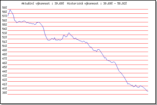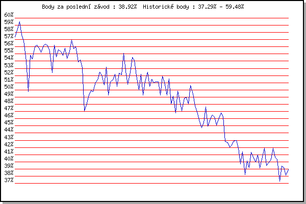 ZávodBodyVýkonnostZměna| 17.05.2006 | Pisárky Anthropos, 6.6 km | 57.40% | 57.40% | | | 22.06.2006 | Palackého vrch dráha, 5 km | 58.51% | 58.17% | +0.77% | | 28.06.2006 | Pisárky Anthropos, 6.6 km | 59.48% | 58.92% | +0.75% | | 19.07.2006 | Líšeň Mariánské údolí, 11.1 km | 57.64% | 58.51% | -0.41% | | 16.08.2006 | Obřany, 8.8 km | 56.81% | 58.11% | -0.40% | | 23.08.2006 | Líšeň Mariánské údolí, 11.1 km | 54.02% | 57.52% | -0.59% | | 30.08.2006 | Veselka Popůvky Vintrovna, 7.9 km | 49.81% | 56.40% | -1.12% | | 13.06.2007 | Pisárky Anthropos, 6.6 km | 54.79% | 56.26% | -0.14% | | 20.06.2007 | Palackého vrch Běh Olympijského dne | 54.32% | 55.83% | -0.43% | | 27.06.2007 | Obřany, 8.8 km | 56.05% | 55.99% | +0.16% | | 04.07.2007 | Líšeň Mariánské údolí, 11.1 km | 56.22% | 56.15% | +0.16% | | 18.07.2007 | Moravská Slávia dráha, 15 km | 55.80% | 56.15% | 0.00% | | 25.07.2007 | Pisárky Anthropos, 6.6 km | 55.22% | 55.99% | -0.16% | | 01.08.2007 | Obřany, 8.8 km | 56.17% | 56.11% | +0.12% | | 08.08.2007 | Líšeň Mariánské údolí, 11.1 km | 56.35% | 56.21% | +0.10% | | 15.08.2007 | Moravská Slávia dráha, 10 km | 56.19% | 56.26% | +0.05% | | 22.08.2007 | Veselka, Popůvky Vintrovna, 7.9 km | 55.35% | 56.08% | -0.18% | | 08.05.2008 | Běh o pohár pivovaru Černá hora, 9.2 | 52.39% | 55.78% | -0.30% | | 14.05.2008 | Pisárky Anthropos, 6.3 km | 56.20% | 56.00% | +0.22% | | 21.05.2008 | Obřany, 8.8 km | 54.60% | 55.72% | -0.28% | | 28.05.2008 | Líšeň Mariánské údolí, 11.1 km | 55.63% | 55.75% | +0.03% | | 04.06.2008 | Veselka, Popůvky Vintrovna, 9.6 km | 55.28% | 55.70% | -0.05% | | 11.06.2008 | Pisárky Anthropos, 6.3 km | 54.85% | 55.53% | -0.17% | | 18.06.2008 | Obřany, 8.8 km | 55.83% | 55.64% | +0.11% | | 21.06.2008 | Běh kolem Mohyly míru, 12.3 km | 54.40% | 55.43% | -0.21% | | 02.07.2008 | Líšeň Mariánské údolí, 11.1 km | 55.38% | 55.47% | +0.04% | | 09.07.2008 | Veselka, Popůvky Vintrovna, 7.9 km | 56.93% | 55.88% | +0.41% | | 16.07.2008 | Pisárky Anthropos, 6.3 km | 55.74% | 55.90% | +0.02% | | 23.07.2008 | Moravská Slavia , 15 km | 56.05% | 55.98% | +0.08% | | 30.07.2008 | Obřany, 8.8 km | 53.92% | 55.70% | -0.28% | | 20.08.2008 | Moravská Slavia dráha, 10 km | 54.19% | 55.41% | -0.29% | | 28.09.2008 | Blažovice Svatováclavský běh, 11 km | 53.01% | 55.11% | -0.30% | | 29.06.2011 | Obřany, 8.8 km | 47.08% | 54.69% | -0.42% | | 20.07.2011 | AC Moravská Slávia, 5km atletický o | 48.12% | 53.44% | -1.25% | | 03.08.2011 | Palackého vrch, 7.1 km | 49.29% | 52.69% | -0.75% | | 10.08.2011 | Obřany, 8.8 km | 49.90% | 52.22% | -0.47% | | 17.08.2011 | AC Moravská Slávia, 10km atletický | 49.77% | 51.80% | -0.42% | | 24.08.2011 | Líšeň Mariánské údolí, 11.1 km | 51.05% | 51.74% | -0.06% | | 21.09.2011 | AC Moravská Slávia Brno, 1hod atlet | 51.38% | 51.77% | +0.03% | | 28.09.2011 | Blažovice – Svatováclavský běh , 11 k | 52.46% | 52.04% | +0.27% | | 09.05.2012 | Pisárky Anthropos, 6 km | 52.05% | 52.15% | +0.11% | | 23.05.2012 | Obřany, 8.8 km | 50.69% | 51.90% | -0.25% | | 30.05.2012 | Líšeň Mariánské údolí, 11 km | 53.21% | 52.31% | +0.41% | | 13.06.2012 | Pisárky Anthropos, 6 km | 49.30% | 51.80% | -0.51% | | 20.06.2012 | Palackého vrch – Běh Olympijského dne | 51.11% | 51.75% | -0.05% | | 27.06.2012 | Obřany, 8.8 km | 51.43% | 51.77% | +0.02% | | 18.07.2012 | Atletický stadión Pod Palackého vrche | 52.16% | 51.93% | +0.16% | | 25.07.2012 | Pisárky Anthropos, 6 km | 50.49% | 51.65% | -0.28% | | 01.08.2012 | Palackého vrch, 7.1 km | 52.32% | 51.87% | +0.22% | | 08.08.2012 | Obřany, 8.8 km | 52.15% | 52.02% | +0.15% | | 15.08.2012 | Atletický stadión Pod Palackého vrche | 55.08% | 52.87% | +0.85% | | 22.08.2012 | Líšeň Mariánské údolí, 11 km | 52.61% | 52.89% | +0.02% | | 29.08.2012 | Pisárky Anthropos, 6 km | 50.77% | 52.49% | -0.40% | | 12.09.2012 | Líšeň Mariánské údolí, 11 km | 52.48% | 52.56% | +0.07% | | 19.09.2012 | Atletický stadión Pod Palackého vrche | 54.55% | 53.16% | +0.60% | | 28.09.2012 | Blažovice – Svatováclavský běh, 11 km | 54.09% | 53.50% | +0.34% | | 15.05.2013 | Pisárky Anthropos, 6 km | 51.97% | 53.20% | -0.30% | | 29.05.2013 | Obřany, 8.8 km | 49.96% | 52.75% | -0.45% | | 05.06.2013 | Líšeň, 11 km | 52.16% | 52.72% | -0.03% | | 19.06.2013 | Pisárky Anthropos, 6 km | 49.26% | 52.19% | -0.53% | | 26.06.2013 | Palackého vrch – Běh Olympijského dne | 51.23% | 52.07% | -0.12% | | 03.07.2013 | Obřany, 8.8 km | 52.46% | 52.27% | +0.20% | | 17.07.2013 | Atletický stadión Pod Palackého vrche | 50.46% | 51.92% | -0.35% | | 24.07.2013 | Pisárky Anthropos, 6 km | 51.47% | 51.88% | -0.04% | | 31.07.2013 | Palackého vrch, 7.1 km | 50.96% | 51.72% | -0.16% | | 07.08.2013 | Obřany, 8.8 km | 51.10% | 51.62% | -0.10% | | 14.08.2013 | Atletický stadión Pod Palackého vrche | 51.15% | 51.55% | -0.07% | | 21.08.2013 | Líšeň, 11 km | 49.29% | 51.28% | -0.27% | | 04.09.2013 | Atletický stadión Pod Palackého vrche | 51.94% | 51.54% | +0.26% | | 11.09.2013 | Líšeň, 11 km | 51.07% | 51.48% | -0.06% | | 18.09.2013 | Pisárky Anthropos, 6 km | 49.28% | 51.10% | -0.38% | | 28.09.2013 | Blažovice – Svatováclavský běh, 11 km | 51.53% | 51.29% | +0.19% | | 14.05.2014 | Pisárky Anthropos, 6 km | 48.05% | 50.90% | -0.39% | | 18.06.2014 | Pisárky Anthropos, 6 km | 49.13% | 50.55% | -0.35% | | 25.06.2014 | Palackého vrch – Běh Olympijského dne | 46.81% | 50.10% | -0.45% | | 02.07.2014 | Obřany, 8.8 km | 49.86% | 50.14% | +0.04% | | 16.07.2014 | Atletický stadión Pod Palackého vrche | 48.40% | 49.81% | -0.33% | | 23.07.2014 | Pisárky Anthropos, 6 km | 47.05% | 49.35% | -0.46% | | 06.08.2014 | Obřany, 8.8 km | 48.84% | 49.33% | -0.02% | | 13.08.2014 | Atletický stadión Pod Palackého vrche | 48.91% | 49.33% | 0.00% | | 20.08.2014 | Líšeň, 11 km | 48.07% | 49.08% | -0.25% | | 03.09.2014 | Atletický stadión Pod P