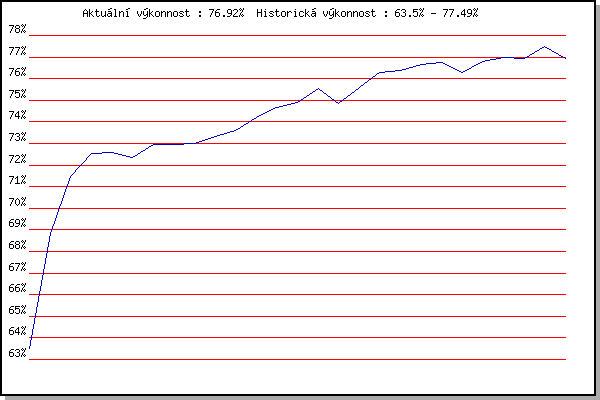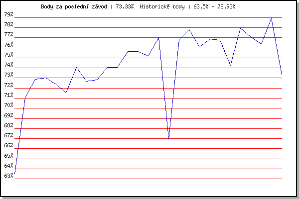 ZávodBodyVýkonnostZměna| 24.08.2011 | Líšeň Mariánské údolí, 11.1 km | 63.50% | 63.50% | | | 31.08.2011 | Popůvky, 7.9 km | 71.05% | 68.83% | +5.33% | | 07.09.2011 | Pisárky Anthropos, 6 km | 72.89% | 71.45% | +2.62% | | 21.09.2011 | AC Moravská Slávia Brno, 1hod atlet | 73.04% | 72.52% | +1.07% | | 28.09.2011 | Blažovice – Svatováclavský běh , 11 k | 72.37% | 72.57% | +0.05% | | 13.05.2015 | Pisárky Anthropos, 6 km | 71.56% | 72.34% | -0.23% | | 27.05.2015 | Obřany, 8.8 km | 74.07% | 72.94% | +0.60% | | 08.07.2015 | Popůvky, 7.9 km | 72.70% | 72.95% | +0.01% | | 15.07.2015 | Atletický stadión Pod Palackého vrche | 72.85% | 73.00% | +0.05% | | 03.05.2017 | Hotel Myslivna, 7 km | 74.07% | 73.34% | +0.34% | | 17.05.2017 | Palackého vrch, 7.1 km | 74.05% | 73.58% | +0.24% | | 24.05.2017 | Obřany, 8.8 km | 75.65% | 74.19% | +0.61% | | 31.05.2017 | Líšeň, 11 km | 75.66% | 74.65% | +0.46% | | 07.06.2017 | Pisárky Anthropos, 6 km | 75.21% | 74.89% | +0.24% | | 14.06.2017 | Popůvky, 7.9 km | 77.01% | 75.54% | +0.65% | | 28.06.2017 | Obřany, 8.8 km | 66.93% | 74.84% | -0.70% | | 02.08.2017 | Líšeň, 11 km | 76.82% | 75.57% | +0.73% | | 23.08.2017 | Popůvky, 7.9 km | 77.83% | 76.30% | +0.73% | | 30.08.2017 | Atletický stadión Pod Palackého vrche | 76.09% | 76.39% | +0.09% | | 13.09.2017 | Pisárky Anthropos, 6 km | 76.89% | 76.64% | +0.25% | | 02.05.2018 | Hotel Myslivna, 7 km | 76.78% | 76.75% | +0.11% | | 16.05.2018 | Palackého vrch, 7.1 km | 74.27% | 76.29% | -0.46% | | 23.05.2018 | Obřany, 8.8 km | 77.95% | 76.80% | +0.51% | | 20.06.2018 | Palackého vrch, 7.1 km | 77.08% | 77.00% | +0.20% | | 11.07.2018 | Hotel Myslivna, 7 km | 76.40% | 76.94% | -0.06% | | 15.08.2018 | Popůvky, 7.9 km | 78.93% | 77.49% | +0.55% | | 05.09.2018 | Obřany, 8.8 km | 73.33% | 76.92% | -0.57% | | | | |