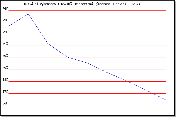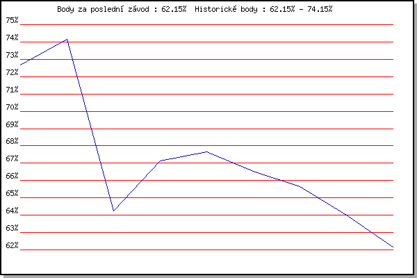 Závod| Body | Výkonnost | Změna | 07.09.2011 | Pisárky Anthropos, 6 km | 72.67% | 72.66% | | 14.09.2011 | Líšeň Mariánské údolí, 11.1 km | 74.15% | 73.70% | +1.04% | 09.05.2012 | Pisárky Anthropos, 6 km | 64.25% | 71.18% | -2.52% | 23.05.2012 | Obřany, 8.8 km | 67.13% | 70.06% | -1.12% | 30.05.2012 | Líšeň Mariánské údolí, 11 km | 67.64% | 69.56% | -0.50% | 13.06.2012 | Pisárky Anthropos, 6 km | 66.54% | 68.76% | -0.80% | 08.08.2012 | Obřany, 8.8 km | 65.66% | 68.04% | -0.72% | 22.08.2012 | Líšeň Mariánské údolí, 11 km | 64.02% | 67.26% | -0.78% | 24.07.2013 | Pisárky Anthropos, 6 km | 62.15% | 66.45% | -0.81% | | |