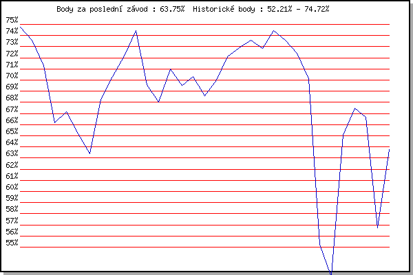 ZávodBodyVýkonnostZměna| 07.09.2011 | Pisárky Anthropos, 6 km | 74.72% | 74.72% | | | 14.09.2011 | Líšeň Mariánské údolí, 11.1 km | 73.55% | 74.20% | -0.52% | | 09.05.2012 | Pisárky Anthropos, 6 km | 71.30% | 73.36% | -0.84% | | 11.09.2013 | Líšeň, 11 km | 66.18% | 71.82% | -1.54% | | 18.09.2013 | Pisárky Anthropos, 6 km | 67.17% | 70.54% | -1.28% | | 14.05.2014 | Pisárky Anthropos, 6 km | 65.16% | 69.30% | -1.24% | | 21.05.2014 | Palackého vrch, 7.1 km | 63.42% | 68.17% | -1.13% | | 17.06.2015 | Pisárky Anthropos, 6 km | 68.25% | 68.45% | +0.28% | | 24.06.2015 | Palackého vrch, 7.1 km | 70.30% | 69.17% | +0.72% | | 01.07.2015 | Obřany, 8.8 km | 72.18% | 70.24% | +1.07% | | 22.07.2015 | Pisárky Anthropos, 6 km | 74.46% | 71.64% | +1.40% | | 09.09.2015 | Líšeň, 11 km | 69.54% | 71.32% | -0.32% | | 16.09.2015 | Pisárky Anthropos, 6 km | 68.05% | 70.65% | -0.67% | | 20.04.2016 | Atletický stadión Pod Palackého vrche | 70.96% | 70.86% | +0.21% | | 27.04.2016 | Pisárky Anthropos, 6 km | 69.50% | 70.65% | -0.21% | | 11.05.2016 | Popůvky, 7.9 km | 70.33% | 70.70% | +0.05% | | 18.05.2016 | Palackého vrch, 7.1 km | 68.60% | 70.28% | -0.42% | | 25.05.2016 | Obřany, 8.8 km | 70.01% | 70.30% | +0.02% | | 01.06.2016 | Líšeň, 11 km | 72.11% | 70.84% | +0.54% | | 08.06.2016 | Popůvky, 7.9 km | 72.89% | 71.47% | +0.63% | | 15.06.2016 | Pisárky Anthropos, 6 km | 73.58% | 72.10% | +0.63% | | 22.06.2016 | Palackého vrch Běh Olympijského dne | 72.82% | 72.41% | +0.31% | | 29.06.2016 | Obřany, 8.8 km | 74.45% | 73.04% | +0.63% | | 13.07.2016 | Atletický stadión Pod Palackého vrche | 73.59% | 73.32% | +0.28% | | 20.07.2016 | Pisárky Anthropos, 6 km | 72.39% | 73.20% | -0.12% | | 10.08.2016 | Hotel Myslivna, 7 km | 70.12% | 72.64% | -0.56% | | 17.05.2017 | Palackého vrch, 7.1 km | 55.24% | 72.00% | -0.64% | | 24.05.2017 | Obřany, 8.8 km | 52.21% | 68.97% | -3.03% | | 17.04.2019 | Atletický stadión Pod Palackého vrche | 65.06% | 68.64% | -0.33% | | 04.09.2019 | Hotel Myslivna, 7 km | 67.46% | 68.95% | +0.31% | | 22.07.2020 | Kociánka, 2.7 km | 66.69% | 68.85% | -0.10% | | 16.09.2020 | Atletický stadión Pod Palackého vrche | 56.72% | 66.72% | -2.13% | | 15.09.2021 | Pod Palackého vrchem 5 km | 63.75% | 66.45% | -0.27% | | | | |