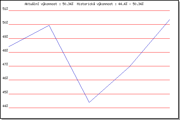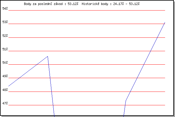 Závod| Body | Výkonnost | Změna | 07.09.2011 | Pisárky Anthropos, 6 km | 48.41% | 48.41% | | 14.09.2011 | Líšeň Mariánské údolí, 11.1 km | 50.61% | 49.95% | +1.54% | 21.09.2011 | AC Moravská Slávia Brno, 1hod atlet | 24.17% | 44.40% | -5.55% | 06.06.2012 | Popůvky, 7.9 km | 47.35% | 46.95% | +2.55% | 12.09.2018 | Pisárky Anthropos, 6 km | 53.12% | 50.34% | +3.39% | | |