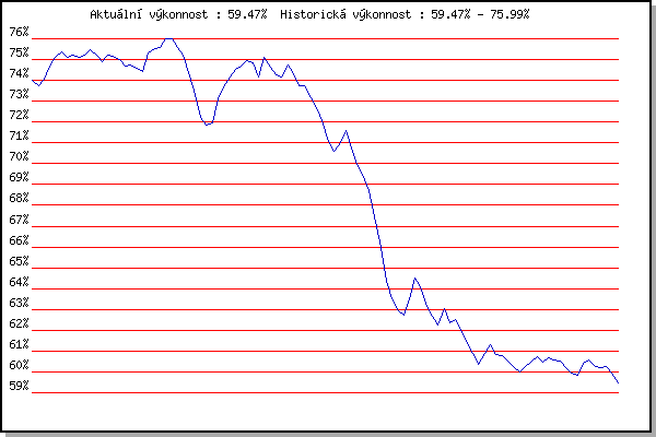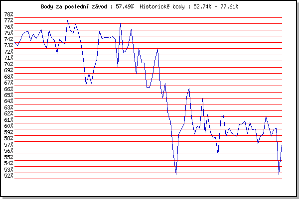 ZávodBodyVýkonnostZměna| 17.05.2006 | Pisárky Anthropos, 6.6 km | 74.00% | 74.00% | | | 31.05.2006 | Palackého vrch vodárna, 9 km | 73.43% | 73.75% | -0.25% | | 07.06.2006 | Líšeň Mariánské údolí, 11.1 km | 74.26% | 74.04% | +0.29% | | 14.06.2006 | Veselka, Popůvky Vintrovna, 7.9 km | 75.38% | 74.66% | +0.62% | | 12.07.2006 | Obřany, 8.8 km | 75.67% | 75.09% | +0.43% | | 19.07.2006 | Líšeň Mariánské údolí, 11.1 km | 75.75% | 75.39% | +0.30% | | 25.07.2006 | Veselka Popůvky Vintrovna, 7.9 km | 74.31% | 75.12% | -0.27% | | 09.08.2006 | Palackého vrch, 9 km | 75.33% | 75.23% | +0.11% | | 16.08.2006 | Obřany, 8.8 km | 74.62% | 75.11% | -0.12% | | 23.08.2006 | Líšeň Mariánské údolí, 11.1 km | 75.28% | 75.20% | +0.09% | | 30.08.2006 | Veselka Popůvky Vintrovna, 7.9 km | 76.11% | 75.49% | +0.29% | | 16.05.2007 | Pisárky Anthropos, 6.6 km | 73.74% | 75.21% | -0.28% | | 23.05.2007 | Obřany, 8.8 km | 73.10% | 74.89% | -0.32% | | 30.05.2007 | Líšeň Mariánské údolí, 11.1 km | 75.90% | 75.23% | +0.34% | | 13.06.2007 | Pisárky Anthropos, 6.6 km | 74.68% | 75.16% | -0.07% | | 20.06.2007 | Palackého vrch Běh Olympijského dne | 74.30% | 75.01% | -0.15% | | 11.07.2007 | Veselka, Popůvky Vintrovna, 7.9 km | 72.19% | 74.68% | -0.33% | | 18.07.2007 | Moravská Slávia dráha, 15 km | 74.50% | 74.72% | +0.04% | | 15.08.2007 | Moravská Slávia dráha, 10 km | 73.98% | 74.60% | -0.12% | | 22.08.2007 | Veselka, Popůvky Vintrovna, 7.9 km | 73.82% | 74.44% | -0.16% | | 28.09.2007 | Blažovice Svatováclavský běh, 11 km | 77.61% | 75.29% | +0.85% | | 08.05.2008 | Běh o pohár pivovaru Černá hora, 9.2 | 75.87% | 75.50% | +0.21% | | 14.05.2008 | Pisárky Anthropos, 6.3 km | 75.45% | 75.58% | +0.08% | | 28.05.2008 | Líšeň Mariánské údolí, 11.1 km | 76.92% | 75.99% | +0.41% | | 04.06.2008 | Veselka, Popůvky Vintrovna, 9.6 km | 75.59% | 75.98% | -0.01% | | 11.06.2008 | Pisárky Anthropos, 6.3 km | 73.89% | 75.58% | -0.40% | | 18.06.2008 | Obřany, 8.8 km | 71.15% | 75.19% | -0.39% | | 21.06.2008 | Běh kolem Mohyly míru, 12.3 km | 67.15% | 74.39% | -0.80% | | 25.06.2008 | Běh Olympijského dne, 7.1 km | 68.93% | 73.33% | -1.06% | | 02.07.2008 | Líšeň Mariánské údolí, 11.1 km | 67.41% | 72.24% | -1.09% | | 06.08.2008 | Líšeň Mariánské údolí, 11.1 km | 69.77% | 71.87% | -0.37% | | 13.08.2008 | Veselka, Popůvky Vintrovna, 7.9 km | 71.35% | 71.95% | +0.08% | | 28.09.2008 | Blažovice Svatováclavský běh, 11 km | 75.83% | 73.10% | +1.15% | | 08.05.2009 | Běh o pohár pivovaru Černá hora, 9. | 74.62% | 73.69% | +0.59% | | 13.05.2009 | Pisárky Anthropos, 6.3 km | 74.78% | 74.16% | +0.47% | | 20.05.2009 | Obřany, 8.8 km | 74.75% | 74.51% | +0.35% | | 10.06.2009 | Pisárky Anthropos, 6.3 km | 74.70% | 74.71% | +0.20% | | 17.06.2009 | Obřany, 8.8 km | 74.98% | 74.93% | +0.22% | | 01.07.2009 | Líšeň Mariánské údolí, 11.1 km | 74.45% | 74.84% | -0.09% | | 08.07.2009 | Veselka, Popůvky Vintrovna, 7.9 km | 70.11% | 74.16% | -0.68% | | 22.07.2009 | Moravská Slavia dráha, 15 km | 77.11% | 75.11% | +0.95% | | 29.07.2009 | Obřany, 8.8 km | 72.37% | 74.65% | -0.46% | | 05.08.2009 | Líšeň Mariánské údolí, 11.1 km | 72.60% | 74.26% | -0.39% | | 19.08.2009 | Moravská Slavia dráha, 10 km | 73.51% | 74.17% | -0.09% | | 28.09.2009 | Blažovice Svatováclavský běh, 11 km | 76.14% | 74.75% | +0.58% | | 16.06.2010 | Pisárky Anthropos, 6.3 km | 72.58% | 74.32% | -0.43% | | 23.06.2010 | Palackého vrch Běh Olympijského dne | 68.93% | 73.76% | -0.56% | | 30.06.2010 | Obřany, 8.8 km | 72.99% | 73.76% | 0.00% | | 14.07.2010 | Veselka, Popůvky Vintrovna, 7.9 km | 70.72% | 73.16% | -0.60% | | 11.08.2010 | Obřany, 8.8 km | 70.66% | 72.67% | -0.49% | | 18.08.2010 | Moravská Slavia dráha, 10 km | 66.76% | 72.08% | -0.59% | | 25.08.2010 | Líšeň Mariánské údolí, 11.1 km | 66.76% | 71.04% | -1.04% | | 08.09.2010 | Pisárky Anthropos, 6.3 km | 68.39% | 70.60% | -0.44% | | 28.09.2010 | Blažovice Svatováclavský běh, 9.4 km | 71.01% | 70.89% | +0.29% | | 09.10.2010 | Mizuno sedmička, 7 km | 72.95% | 71.58% | +0.69% | | 11.05.2011 | Pisárky Anthropos, 6 km | 67.17% | 70.73% | -0.85% | | 18.05.2011 | Palackého vrch, 7.1 km | 64.96% | 69.98% | -0.75% | | 01.06.2011 | Líšeň Mariánské údolí, 11.1 km | 67.37% | 69.49% | -0.49% | | 15.06.2011 | Pisárky Anthropos, 6 km | 62.19% | 68.68% | -0.81% | | 27.07.2011 | Pisárky Anthropos, 6 km | 61.24% | 67.43% | -1.25% | | 28.09.2011 | Blažovice – Svatováclavský běh , 11 k | 56.20% | 66.24% | -1.19% | | 06.06.2012 | Popůvky, 7.9 km | 52.76% | 64.36% | -1.88% | | 27.06.2012 | Obřany, 8.8 km | 59.20% | 63.50% | -0.86% | | 11.07.2012 | Popůvky, 7.9 km | 59.94% | 62.98% | -0.52% | | 08.08.2012 | Obřany, 8.8 km | 60.83% | 62.71% | -0.27% | | 22.08.2012 | Líšeň Mariánské údolí, 11 km | 65.28% | 63.53% | +0.82% | | 28.09.2012 | Blažovice – Svatováclavský běh, 11 km | 66.61% | 64.52% | +0.99% | | 15.05.2013 | Pisárky Anthropos, 6 km | 61.82% | 64.08% | -0.44% | | 05.06.2013 | Líšeň, 11 km | 59.22% | 63.17% | -0.91% | | 12.06.2013 | Popůvky, 7.3 km | 60.47% | 62.70% | -0.47% | | 21.05.2014 | Palackého vrch, 7.1 km | 60.15% | 62.24% | -0.46% | | 04.06.2014 | Líšeň, 11 km | 64.94% | 63.05% | +0.81% | | 11.06.2014 | Popůvky, 7.9 km | 59.40% | 62.35% | -0.70% | | 30.07.2014 | Palackého vrch, 7.1 km | 62.39% | 62.51% | +0.16% | | 27.05.2015 | Obřany, 8.8 km | 59.50% | 61.92% | -0.59% | | 10.06.2015 | Popůvky, 7.9 km | 58.56% | 61.39% | -0.53% | | 01.07.2015 | Obřany, 8.8 km | 58.69% | 60.87% | -0.52% | | 08.07.2015 | Popůvky, 7.9 km | 55.87% | 60.39% | -0.48% | | 02.09.2015 | Atletický stadión Pod Palackého vrche | 61.94% | 60.89% | +0.50% | | 28.09.2015 | Blažovice – Svatováclavský běh, 11 km | 62.16% | 61.33% | +0.44% | | 27.04.2016 | Pisárky Anthropos, 6 km | 58.81% | 60.84% | -0.49% | | 04.05.2016 | Líšeň, 11 km | 60.18% | 60.78% | -0.06% | | 01.06.20