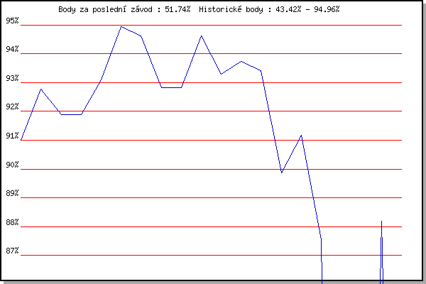 ZávodBodyVýkonnostZměna| 09.05.2012 | Pisárky Anthropos, 6 km | 91.01% | 91.01% | | | 16.05.2012 | Palackého vrch, 7.1 km | 92.77% | 92.23% | +1.22% | | 23.05.2012 | Obřany, 8.8 km | 91.90% | 92.18% | -0.05% | | 06.06.2012 | Popůvky, 7.9 km | 91.89% | 92.13% | -0.05% | | 13.06.2012 | Pisárky Anthropos, 6 km | 93.11% | 92.51% | +0.38% | | 20.06.2012 | Palackého vrch – Běh Olympijského dne | 94.96% | 93.39% | +0.88% | | 11.07.2012 | Popůvky, 7.9 km | 94.63% | 93.88% | +0.49% | | 18.07.2012 | Atletický stadión Pod Palackého vrche | 92.83% | 93.69% | -0.19% | | 25.07.2012 | Pisárky Anthropos, 6 km | 92.82% | 93.51% | -0.18% | | 01.08.2012 | Palackého vrch, 7.1 km | 94.62% | 93.86% | +0.35% | | 08.08.2012 | Obřany, 8.8 km | 93.30% | 93.77% | -0.09% | | 15.08.2012 | Atletický stadión Pod Palackého vrche | 93.75% | 93.81% | +0.04% | | 29.08.2012 | Pisárky Anthropos, 6 km | 93.42% | 93.76% | -0.05% | | 05.09.2012 | Popůvky, 7.9 km | 89.86% | 93.46% | -0.30% | | 12.09.2012 | Líšeň Mariánské údolí, 11 km | 91.17% | 93.00% | -0.46% | | 13.08.2014 | Atletický stadión Pod Palackého vrche | 87.55% | 92.39% | -0.61% | | 20.05.2015 | Palackého vrch, 7.1 km | 43.42% | 91.24% | -1.15% | | 24.06.2015 | Palackého vrch, 7.1 km | 47.05% | 84.15% | -7.09% | | 15.07.2015 | Atletický stadión Pod Palackého vrche | 88.18% | 86.63% | +2.48% | | 24.04.2019 | Pisárky Anthropos, 6 km | 51.74% | 80.94% | -5.69% | | | | |
