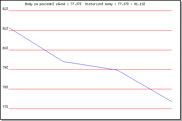 Závod| Body | Výkonnost | Změna | 09.05.2012 | Pisárky Anthropos, 6 km | 81.13% | 81.13% | | 23.05.2012 | Obřany, 8.8 km | 79.40% | 80.37% | -0.76% | 20.06.2012 | Palackého vrch – Běh Olympijského dne | 78.98% | 79.86% | -0.51% | 11.07.2012 | Popůvky, 7.9 km | 77.37% | 79.29% | -0.57% | | |