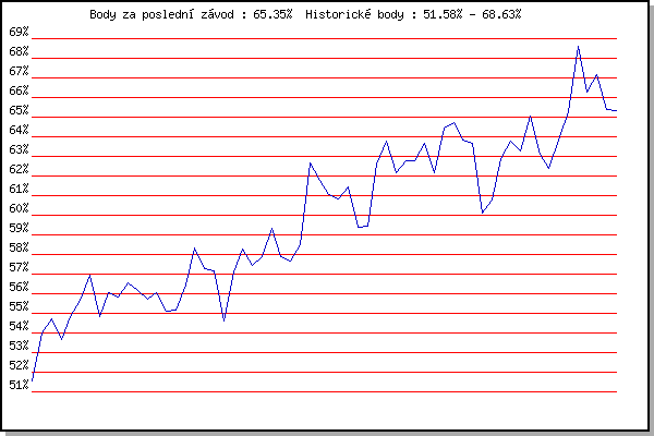 ZávodBodyVýkonnostZměna| 16.05.2012 | Palackého vrch, 7.1 km | 51.58% | 51.58% | | | 23.05.2012 | Obřany, 8.8 km | 53.99% | 53.26% | +1.68% | | 30.05.2012 | Líšeň Mariánské údolí, 11 km | 54.73% | 54.18% | +0.92% | | 06.06.2012 | Popůvky, 7.9 km | 53.68% | 54.12% | -0.06% | | 13.06.2012 | Pisárky Anthropos, 6 km | 54.84% | 54.42% | +0.30% | | 20.06.2012 | Palackého vrch – Běh Olympijského dne | 55.65% | 54.89% | +0.47% | | 27.06.2012 | Obřany, 8.8 km | 56.93% | 55.61% | +0.72% | | 08.08.2012 | Obřany, 8.8 km | 54.84% | 55.48% | -0.13% | | 22.08.2012 | Líšeň Mariánské údolí, 11 km | 56.06% | 55.70% | +0.22% | | 29.08.2012 | Pisárky Anthropos, 6 km | 55.82% | 55.79% | +0.09% | | 05.09.2012 | Popůvky, 7.9 km | 56.53% | 56.04% | +0.25% | | 12.09.2012 | Líšeň Mariánské údolí, 11 km | 56.15% | 56.13% | +0.09% | | 19.09.2012 | Atletický stadión Pod Palackého vrche | 55.70% | 56.08% | -0.05% | | 22.05.2013 | Palackého vrch, 7.1 km | 56.08% | 56.10% | +0.02% | | 29.05.2013 | Obřany, 8.8 km | 55.10% | 55.92% | -0.18% | | 05.06.2013 | Líšeň, 11 km | 55.18% | 55.78% | -0.14% | | 12.06.2013 | Popůvky, 7.3 km | 56.44% | 55.98% | +0.20% | | 26.06.2013 | Palackého vrch – Běh Olympijského dne | 58.31% | 56.62% | +0.64% | | 03.07.2013 | Obřany, 8.8 km | 57.28% | 56.86% | +0.24% | | 10.07.2013 | Popůvky, 7.3 km | 57.16% | 57.02% | +0.16% | | 17.07.2013 | Atletický stadión Pod Palackého vrche | 54.59% | 56.63% | -0.39% | | 24.07.2013 | Pisárky Anthropos, 6 km | 57.12% | 56.84% | +0.21% | | 31.07.2013 | Palackého vrch, 7.1 km | 58.30% | 57.30% | +0.46% | | 07.08.2013 | Obřany, 8.8 km | 57.44% | 57.43% | +0.13% | | 14.08.2013 | Atletický stadión Pod Palackého vrche | 57.88% | 57.61% | +0.18% | | 21.08.2013 | Líšeň, 11 km | 59.33% | 58.09% | +0.48% | | 04.09.2013 | Atletický stadión Pod Palackého vrche | 57.88% | 58.09% | 0.00% | | 11.09.2013 | Líšeň, 11 km | 57.65% | 58.03% | -0.06% | | 18.09.2013 | Pisárky Anthropos, 6 km | 58.51% | 58.19% | +0.16% | | 20.05.2015 | Palackého vrch, 7.1 km | 62.68% | 59.38% | +1.19% | | 10.06.2015 | Popůvky, 7.9 km | 61.80% | 60.08% | +0.70% | | 15.07.2015 | Atletický stadión Pod Palackého vrche | 61.05% | 60.44% | +0.36% | | 22.07.2015 | Pisárky Anthropos, 6 km | 60.84% | 60.67% | +0.23% | | 29.07.2015 | Palackého vrch, 7.1 km | 61.46% | 61.01% | +0.34% | | 19.08.2015 | Líšeň, 10.6 km | 59.39% | 60.74% | -0.27% | | 02.09.2015 | Atletický stadión Pod Palackého vrche | 59.45% | 60.51% | -0.23% | | 25.05.2016 | Obřany, 8.8 km | 62.61% | 61.10% | +0.59% | | 22.06.2016 | Palackého vrch Běh Olympijského dne | 63.78% | 61.86% | +0.76% | | 13.07.2016 | Atletický stadión Pod Palackého vrche | 62.14% | 62.06% | +0.20% | | 24.08.2016 | Popůvky, 7.9 km | 62.78% | 62.36% | +0.30% | | 31.08.2016 | Atletický stadión Pod Palackého vrche | 62.76% | 62.59% | +0.23% | | 07.09.2016 | Pisárky Anthropos, 6 km | 63.69% | 62.94% | +0.35% | | 02.08.2017 | Líšeň, 11 km | 62.15% | 62.81% | -0.13% | | 25.04.2018 | Atletický stadión Pod Palackého vrche | 64.45% | 63.25% | +0.44% | | 02.05.2018 | Hotel Myslivna, 7 km | 64.74% | 63.69% | +0.44% | | 09.05.2018 | Popůvky, 7.9 km | 63.83% | 63.80% | +0.11% | | 16.05.2018 | Palackého vrch, 7.1 km | 63.69% | 63.85% | +0.05% | | 06.06.2018 | Pisárky Anthropos, 6 km | 60.11% | 63.39% | -0.46% | | 13.06.2018 | Atletický stadión Pod Palackého vrche | 60.75% | 62.90% | -0.49% | | 20.06.2018 | Palackého vrch, 7.1 km | 62.89% | 63.00% | +0.10% | | 27.06.2018 | Popůvky, 7.9 km | 63.76% | 63.30% | +0.30% | | 11.07.2018 | Hotel Myslivna, 7 km | 63.29% | 63.43% | +0.13% | | 08.08.2018 | Hotel Myslivna, 7 km | 65.06% | 63.91% | +0.48% | | 15.08.2018 | Popůvky, 7.9 km | 63.12% | 63.77% | -0.14% | | 22.08.2018 | Palackého vrch, 7.1 km | 62.38% | 63.51% | -0.26% | | 12.09.2018 | Pisárky Anthropos, 6 km | 63.84% | 63.65% | +0.14% | | 10.07.2019 | Hotel Myslivna, 7 km | 65.29% | 64.12% | +0.47% | | 29.07.2020 | Hotel Myslivna, 7 km | 68.63% | 65.35% | +1.23% | | 05.08.2020 | Popůvky, 7.9 km | 66.25% | 65.69% | +0.34% | | 12.08.2020 | Palackého vrch, 7.1 km | 67.18% | 66.18% | +0.49% | | 19.08.2020 | Obřany, 8.8 km | 65.39% | 66.11% | -0.07% | | 09.09.2020 | Pisárky Anthropos, 6 km | 65.35% | 66.04% | -0.07% | | | | |