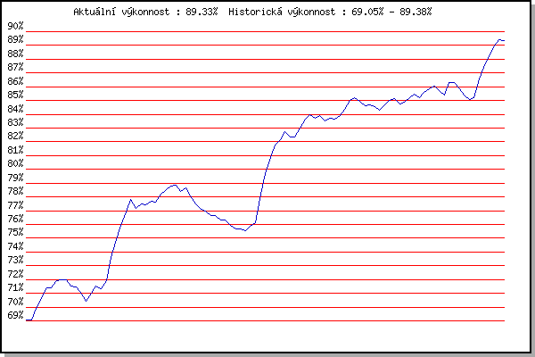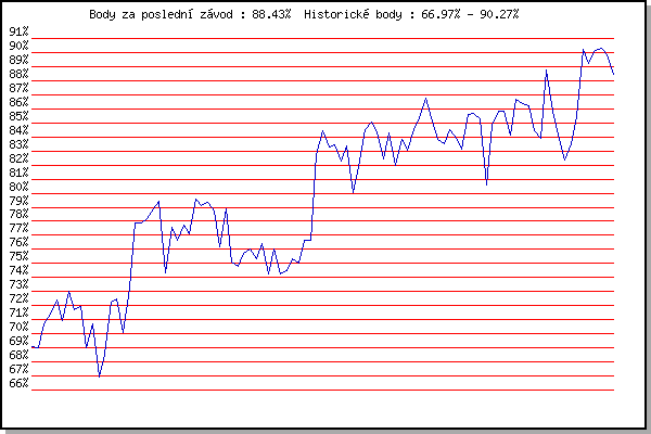 ZávodBodyVýkonnostZměna| 09.05.2012 | Pisárky Anthropos, 6 km | 69.06% | 69.06% | | | 16.05.2012 | Palackého vrch, 7.1 km | 69.04% | 69.05% | -0.01% | | 23.05.2012 | Obřany, 8.8 km | 70.68% | 69.89% | +0.84% | | 30.05.2012 | Líšeň Mariánské údolí, 11 km | 71.37% | 70.60% | +0.71% | | 06.06.2012 | Popůvky, 7.9 km | 72.38% | 71.38% | +0.78% | | 13.06.2012 | Pisárky Anthropos, 6 km | 70.96% | 71.39% | +0.01% | | 20.06.2012 | Palackého vrch – Běh Olympijského dne | 72.99% | 71.94% | +0.55% | | 27.06.2012 | Obřany, 8.8 km | 71.75% | 71.96% | +0.02% | | 18.07.2012 | Atletický stadión Pod Palackého vrche | 71.95% | 72.01% | +0.05% | | 25.07.2012 | Pisárky Anthropos, 6 km | 69.05% | 71.55% | -0.46% | | 08.08.2012 | Obřany, 8.8 km | 70.74% | 71.46% | -0.09% | | 22.08.2012 | Líšeň Mariánské údolí, 11 km | 66.97% | 70.92% | -0.54% | | 29.08.2012 | Pisárky Anthropos, 6 km | 68.57% | 70.45% | -0.47% | | 05.09.2012 | Popůvky, 7.9 km | 72.28% | 71.03% | +0.58% | | 12.09.2012 | Líšeň Mariánské údolí, 11 km | 72.51% | 71.54% | +0.51% | | 19.09.2012 | Atletický stadión Pod Palackého vrche | 70.13% | 71.32% | -0.22% | | 28.09.2012 | Blažovice – Svatováclavský běh, 11 km | 73.28% | 71.94% | +0.62% | | 15.05.2013 | Pisárky Anthropos, 6 km | 77.86% | 73.59% | +1.65% | | 22.05.2013 | Palackého vrch, 7.1 km | 77.87% | 74.87% | +1.28% | | 29.05.2013 | Obřany, 8.8 km | 78.18% | 75.94% | +1.07% | | 05.06.2013 | Líšeň, 11 km | 78.91% | 76.93% | +0.99% | | 12.06.2013 | Popůvky, 7.3 km | 79.42% | 77.79% | +0.86% | | 03.07.2013 | Obřany, 8.8 km | 74.30% | 77.19% | -0.60% | | 10.07.2013 | Popůvky, 7.3 km | 77.60% | 77.49% | +0.30% | | 17.07.2013 | Atletický stadión Pod Palackého vrche | 76.63% | 77.43% | -0.06% | | 31.07.2013 | Palackého vrch, 7.1 km | 77.75% | 77.67% | +0.24% | | 14.08.2013 | Atletický stadión Pod Palackého vrche | 77.08% | 77.65% | -0.02% | | 21.08.2013 | Líšeň, 11 km | 79.57% | 78.19% | +0.54% | | 28.08.2013 | Popůvky, 7.3 km | 79.10% | 78.49% | +0.30% | | 04.09.2013 | Atletický stadión Pod Palackého vrche | 79.31% | 78.77% | +0.28% | | 11.09.2013 | Líšeň, 11 km | 78.75% | 78.85% | +0.08% | | 18.09.2013 | Pisárky Anthropos, 6 km | 76.15% | 78.40% | -0.45% | | 28.09.2013 | Blažovice – Svatováclavský běh, 11 km | 78.85% | 78.63% | +0.23% | | 14.05.2014 | Pisárky Anthropos, 6 km | 75.12% | 78.09% | -0.54% | | 21.05.2014 | Palackého vrch, 7.1 km | 74.78% | 77.49% | -0.60% | | 04.06.2014 | Líšeň, 11 km | 75.72% | 77.18% | -0.31% | | 11.06.2014 | Popůvky, 7.9 km | 76.01% | 76.99% | -0.19% | | 18.06.2014 | Pisárky Anthropos, 6 km | 75.30% | 76.66% | -0.33% | | 25.06.2014 | Palackého vrch – Běh Olympijského dne | 76.39% | 76.66% | 0.00% | | 09.07.2014 | Popůvky, 7.9 km | 74.24% | 76.33% | -0.33% | | 16.07.2014 | Atletický stadión Pod Palackého vrche | 76.06% | 76.34% | +0.01% | | 30.07.2014 | Palackého vrch, 7.1 km | 74.26% | 75.95% | -0.39% | | 06.08.2014 | Obřany, 8.8 km | 74.49% | 75.67% | -0.28% | | 13.08.2014 | Atletický stadión Pod Palackého vrche | 75.35% | 75.66% | -0.01% | | 20.08.2014 | Líšeň, 11 km | 75.00% | 75.56% | -0.10% | | 03.09.2014 | Atletický stadión Pod Palackého vrche | 76.63% | 75.88% | +0.32% | | 10.09.2014 | Líšeň, 11 km | 76.64% | 76.14% | +0.26% | | 13.05.2015 | Pisárky Anthropos, 6 km | 82.78% | 77.90% | +1.76% | | 20.05.2015 | Palackého vrch, 7.1 km | 84.41% | 79.72% | +1.82% | | 27.05.2015 | Obřany, 8.8 km | 83.25% | 80.83% | +1.11% | | 03.06.2015 | Líšeň, 11 km | 83.43% | 81.75% | +0.92% | | 10.06.2015 | Popůvky, 7.9 km | 82.27% | 82.15% | +0.40% | | 24.06.2015 | Palackého vrch, 7.1 km | 83.34% | 82.72% | +0.57% | | 20.04.2016 | Atletický stadión Pod Palackého vrche | 80.03% | 82.35% | -0.37% | | 27.04.2016 | Pisárky Anthropos, 6 km | 81.91% | 82.37% | +0.02% | | 04.05.2016 | Líšeň, 11 km | 84.48% | 83.01% | +0.64% | | 11.05.2016 | Popůvky, 7.9 km | 85.05% | 83.67% | +0.66% | | 18.05.2016 | Palackého vrch, 7.1 km | 84.39% | 83.96% | +0.29% | | 01.06.2016 | Líšeň, 11 km | 82.45% | 83.68% | -0.28% | | 26.04.2017 | Pisárky Anthropos, 6 km | 84.30% | 83.92% | +0.24% | | 03.05.2017 | Hotel Myslivna, 7 km | 81.95% | 83.53% | -0.39% | | 10.05.2017 | Popůvky, 7.9 km | 83.83% | 83.69% | +0.16% | | 17.05.2017 | Palackého vrch, 7.1 km | 83.07% | 83.62% | -0.07% | | 24.05.2017 | Obřany, 8.8 km | 84.52% | 83.92% | +0.30% | | 31.05.2017 | Líšeň, 11 km | 85.39% | 84.36% | +0.44% | | 14.06.2017 | Popůvky, 7.9 km | 86.72% | 85.02% | +0.66% | | 12.07.2017 | Atletický stadión Pod Palackého vrche | 85.36% | 85.20% | +0.18% | | 19.07.2017 | Pisárky Anthropos, 6 km | 83.79% | 84.94% | -0.26% | | 02.08.2017 | Líšeň, 11 km | 83.48% | 84.65% | -0.29% | | 09.08.2017 | Hotel Myslivna, 7 km | 84.51% | 84.68% | +0.03% | | 16.08.2017 | Obřany, 8.8 km | 83.86% | 84.53% | -0.15% | | 23.08.2017 | Popůvky, 7.9 km | 83.12% | 84.29% | -0.24% | | 30.08.2017 | Atletický stadión Pod Palackého vrche | 85.62% | 84.68% | +0.39% | | 06.09.2017 | Líšeň, 11 km | 85.64% | 84.99% | +0.31% | | 13.09.2017 | Pisárky Anthropos, 6 km | 85.28% | 85.14% | +0.15% | | 09.05.2018 | Popůvky, 7.9 km | 80.61% | 84.73% | -0.41% | | 16.05.2018 | Palackého vrch, 7.1 km | 84.85% | 84.86% | +0.13% | | 23.05.2018 | Obřany, 8.8 km | 85.86% | 85.20% | +0.34% | | 30.05.2018 | Líšeň, 11 km | 85.80% | 85.43% | +0.23% | | 06.06.2018 | Pisárky Anthropos, 6 km | 84.14% | 85.18% | -0.25% | | 13.06.2018 | Atletický stadión Pod Palackého vrche | 86.64% | 85.60% | +0.42% | | 27.06.2018 | Popůvky, 7.9 km | 86.36% | 85.87% | +0.27% | | 11.07.2018 | Hotel Myslivna, 7 km | 86.18% | 86.03% | +0.16% | | 01.08.2018 | Pisárky Anthropos, 6 km | 84.41% | 85.71% | -0.32% | | 15.08.2018 | Popůvky, 7.9 km | 83.89% | 85.39% | -0.32% | | 17.04.2019 | Atletický stadión Pod Palackého vrche | 88.75% | 86.31% | +0.92% | | 15.05.2019 | Kociánka, 3.2 km | 85.83% | 86.30% | -0.01% | | 26.06.2019 | Pisá