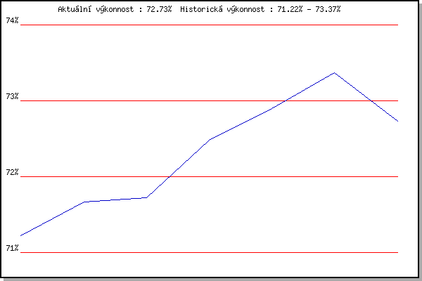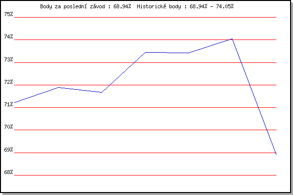 Závod| Body | Výkonnost | Změna | 09.05.2012 | Pisárky Anthropos, 6 km | 71.22% | 71.22% | | 16.05.2012 | Palackého vrch, 7.1 km | 71.88% | 71.67% | +0.45% | 30.05.2012 | Líšeň Mariánské údolí, 11 km | 71.68% | 71.72% | +0.05% | 06.06.2012 | Popůvky, 7.9 km | 73.44% | 72.48% | +0.76% | 13.06.2012 | Pisárky Anthropos, 6 km | 73.43% | 72.90% | +0.42% | 20.06.2012 | Palackého vrch – Běh Olympijského dne | 74.05% | 73.37% | +0.47% | 19.09.2012 | Atletický stadión Pod Palackého vrche | 68.94% | 72.73% | -0.64% | | |