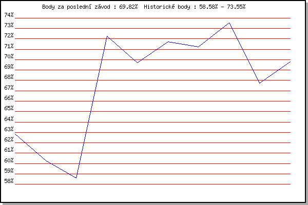 ZávodBodyVýkonnostZměna| 09.05.2012 | Pisárky Anthropos, 6 km | 62.84% | 62.84% | | | 16.05.2012 | Palackého vrch, 7.1 km | 60.26% | 61.71% | -1.13% | | 23.05.2012 | Obřany, 8.8 km | 58.58% | 60.69% | -1.02% | | 17.04.2019 | Atletický stadión Pod Palackého vrche | 72.29% | 66.02% | +5.33% | | 24.04.2019 | Pisárky Anthropos, 6 km | 69.70% | 67.90% | +1.88% | | 15.05.2019 | Kociánka, 3.2 km | 71.72% | 69.69% | +1.79% | | 22.05.2019 | Obřany, 8.8 km | 71.24% | 70.70% | +1.01% | | 29.05.2019 | Líšeň, 11 km | 73.55% | 71.94% | +1.24% | | 05.06.2019 | Palackého vrch, 7.1 km | 67.72% | 71.01% | -0.93% | | 12.06.2019 | Popůvky, 7.9 km | 69.82% | 70.85% | -0.16% | | | | |