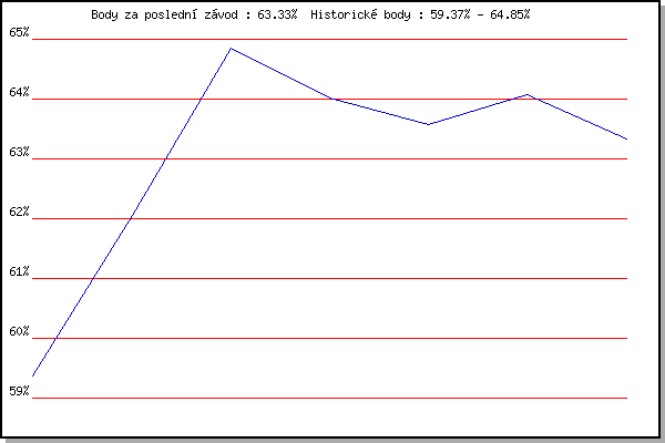 Závod| Body | Výkonnost | Změna | 09.05.2012 | Pisárky Anthropos, 6 km | 59.37% | 59.37% | | 16.05.2012 | Palackého vrch, 7.1 km | 62.05% | 61.25% | +1.88% | 30.05.2012 | Líšeň Mariánské údolí, 11 km | 64.85% | 63.30% | +2.05% | 06.06.2012 | Popůvky, 7.9 km | 64.01% | 63.84% | +0.54% | 13.06.2012 | Pisárky Anthropos, 6 km | 63.57% | 63.87% | +0.03% | 20.06.2012 | Palackého vrch – Běh Olympijského dne | 64.08% | 64.06% | +0.19% | 21.08.2013 | Líšeň, 11 km | 63.33% | 63.87% | -0.19% | | |