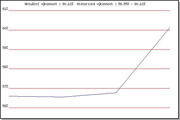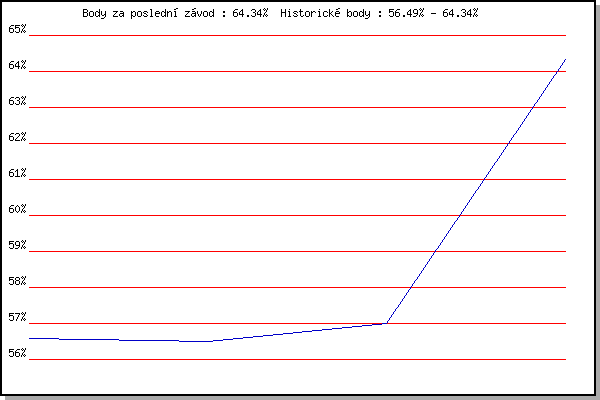 Závod| Body | Výkonnost | Změna | 09.05.2012 | Pisárky Anthropos, 6 km | 56.59% | 56.60% | | 16.05.2012 | Palackého vrch, 7.1 km | 56.49% | 56.55% | -0.05% | 23.05.2012 | Obřany, 8.8 km | 57.00% | 56.78% | +0.23% | 13.06.2012 | Pisárky Anthropos, 6 km | 64.34% | 60.12% | +3.34% | | |