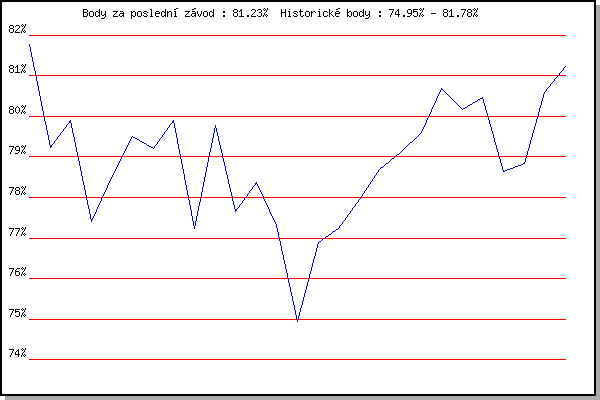 ZávodBodyVýkonnostZměna| 14.06.2006 | Veselka, Popůvky Vintrovna, 7.9 km | 81.78% | 81.79% | | | 08.05.2008 | Běh o pohár pivovaru Černá hora, 9.2 | 79.23% | 80.66% | -1.13% | | 18.06.2008 | Obřany, 8.8 km | 79.91% | 80.42% | -0.24% | | 21.06.2008 | Běh kolem Mohyly míru, 12.3 km | 77.41% | 79.71% | -0.71% | | 02.07.2008 | Líšeň Mariánské údolí, 11.1 km | 78.55% | 79.45% | -0.26% | | 09.07.2008 | Veselka, Popůvky Vintrovna, 7.9 km | 79.51% | 79.57% | +0.12% | | 26.05.2010 | Obřany, 8.8 km | 79.22% | 79.52% | -0.05% | | 28.09.2010 | Blažovice Svatováclavský běh, 9.4 km | 79.89% | 79.69% | +0.17% | | 13.07.2011 | Popůvky, 7.9 km | 77.23% | 79.27% | -0.42% | | 24.08.2011 | Líšeň Mariánské údolí, 11.1 km | 79.78% | 79.52% | +0.25% | | 28.09.2011 | Blažovice – Svatováclavský běh , 11 k | 77.65% | 79.13% | -0.39% | | 28.09.2012 | Blažovice – Svatováclavský běh, 11 km | 78.38% | 79.01% | -0.12% | | 12.06.2013 | Popůvky, 7.3 km | 77.30% | 78.67% | -0.34% | | 03.07.2013 | Obřany, 8.8 km | 74.95% | 78.35% | -0.32% | | 21.08.2013 | Líšeň, 11 km | 76.89% | 78.07% | -0.28% | | 28.09.2013 | Blažovice – Svatováclavský běh, 11 km | 77.24% | 77.92% | -0.15% | | 09.07.2014 | Popůvky, 7.9 km | 77.94% | 77.97% | +0.05% | | 23.07.2014 | Pisárky Anthropos, 6 km | 78.68% | 78.20% | +0.23% | | 30.07.2014 | Palackého vrch, 7.1 km | 79.10% | 78.48% | +0.28% | | 06.08.2014 | Obřany, 8.8 km | 79.61% | 78.83% | +0.35% | | 20.08.2014 | Líšeň, 11 km | 80.70% | 79.39% | +0.56% | | 17.09.2014 | Pisárky Anthropos, 6 km | 80.16% | 79.67% | +0.28% | | 28.09.2014 | Blažovice – Svatováclavský běh, 11 km | 80.46% | 79.95% | +0.28% | | 05.08.2015 | Obřany, 8.8 km | 78.64% | 79.70% | -0.25% | | 28.09.2015 | Blažovice – Svatováclavský běh, 11 km | 78.85% | 79.54% | -0.16% | | 26.07.2017 | Palackého vrch, 7.1 km | 80.58% | 79.84% | +0.30% | | 14.08.2019 | Palackého vrch, 7.1 km | 81.23% | 80.26% | +0.42% | | | | |