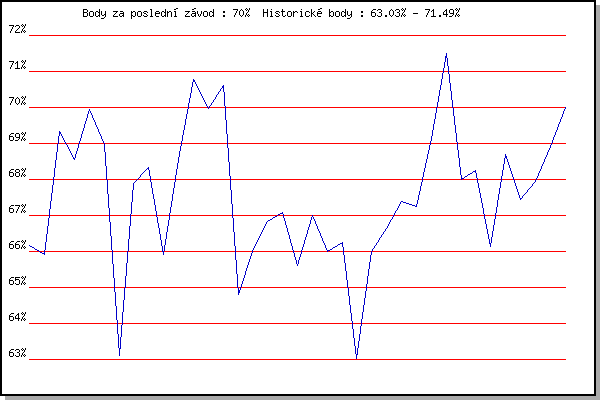 ZávodBodyVýkonnostZměna| 25.07.2007 | Pisárky Anthropos, 6.6 km | 66.16% | 66.16% | | | 28.05.2008 | Líšeň Mariánské údolí, 11.1 km | 65.93% | 66.06% | -0.10% | | 04.06.2008 | Veselka, Popůvky Vintrovna, 9.6 km | 69.33% | 67.77% | +1.71% | | 18.06.2008 | Obřany, 8.8 km | 68.56% | 68.26% | +0.49% | | 09.07.2008 | Veselka, Popůvky Vintrovna, 7.9 km | 69.95% | 69.05% | +0.79% | | 02.06.2010 | Líšeň Mariánské údolí, 11.1 km | 68.97% | 69.22% | +0.17% | | 09.06.2010 | Veselka, Popůvky Vintrovna, 7.9 km | 63.12% | 68.24% | -0.98% | | 28.07.2010 | Pisárky Anthropos, 6.3 km | 67.90% | 68.41% | +0.17% | | 04.08.2010 | Palackého vrch , 7.1 km | 68.34% | 68.53% | +0.12% | | 11.08.2010 | Obřany, 8.8 km | 65.92% | 67.96% | -0.57% | | 18.08.2010 | Moravská Slavia dráha, 10 km | 68.55% | 68.23% | +0.27% | | 25.08.2010 | Líšeň Mariánské údolí, 11.1 km | 70.78% | 69.04% | +0.81% | | 01.09.2010 | Veselka, Popůvky Vintrovna, 7.9 km | 69.98% | 69.44% | +0.40% | | 08.09.2010 | Pisárky Anthropos, 6.3 km | 70.60% | 69.82% | +0.38% | | 11.05.2011 | Pisárky Anthropos, 6 km | 64.81% | 69.07% | -0.75% | | 18.05.2011 | Palackého vrch, 7.1 km | 66.00% | 68.49% | -0.58% | | 25.05.2011 | Obřany, 8.8 km | 66.84% | 68.21% | -0.28% | | 01.06.2011 | Líšeň Mariánské údolí, 11.1 km | 67.08% | 68.03% | -0.18% | | 08.06.2011 | Veselka, Popůvky Vintrovna, 7.9 km | 65.61% | 67.57% | -0.46% | | 15.06.2011 | Pisárky Anthropos, 6 km | 66.99% | 67.52% | -0.05% | | 23.06.2011 | Palackého vrch – Běh Olympijského dne | 66.01% | 67.24% | -0.28% | | 29.06.2011 | Obřany, 8.8 km | 66.26% | 67.05% | -0.19% | | 13.07.2011 | Popůvky, 7.9 km | 63.03% | 66.73% | -0.32% | | 20.07.2011 | AC Moravská Slávia, 5km atletický o | 66.01% | 66.65% | -0.08% | | 10.08.2011 | Obřany, 8.8 km | 66.65% | 66.70% | +0.05% | | 17.08.2011 | AC Moravská Slávia, 10km atletický | 67.38% | 66.91% | +0.21% | | 31.08.2011 | Popůvky, 7.9 km | 67.26% | 67.04% | +0.13% | | 14.09.2011 | Líšeň Mariánské údolí, 11.1 km | 69.14% | 67.62% | +0.58% | | 21.09.2011 | AC Moravská Slávia Brno, 1hod atlet | 71.49% | 68.69% | +1.07% | | 09.05.2012 | Pisárky Anthropos, 6 km | 68.01% | 68.64% | -0.05% | | 16.05.2012 | Palackého vrch, 7.1 km | 68.25% | 68.64% | 0.00% | | 30.05.2012 | Líšeň Mariánské údolí, 11 km | 66.13% | 68.17% | -0.47% | | 13.06.2012 | Pisárky Anthropos, 6 km | 68.68% | 68.40% | +0.23% | | 18.07.2012 | Atletický stadión Pod Palackého vrche | 67.45% | 68.27% | -0.13% | | 25.07.2012 | Pisárky Anthropos, 6 km | 67.95% | 68.27% | 0.00% | | 01.08.2012 | Palackého vrch, 7.1 km | 68.91% | 68.48% | +0.21% | | 29.08.2012 | Pisárky Anthropos, 6 km | 70.00% | 68.91% | +0.43% | | | | |