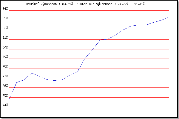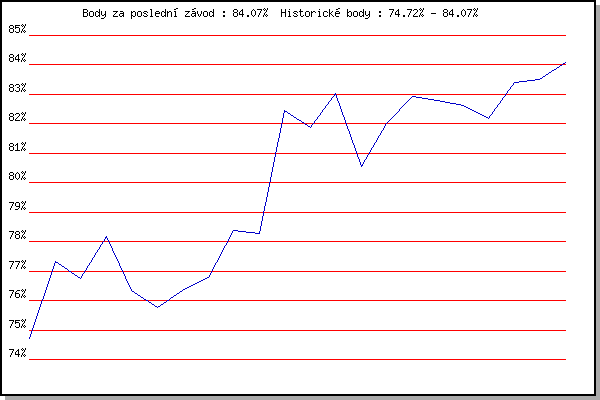 ZávodBodyVýkonnostZměna| 23.05.2012 | Obřany, 8.8 km | 74.72% | 74.72% | | | 13.06.2012 | Pisárky Anthropos, 6 km | 77.32% | 76.54% | +1.82% | | 27.06.2012 | Obřany, 8.8 km | 76.74% | 76.82% | +0.28% | | 11.07.2012 | Popůvky, 7.9 km | 78.18% | 77.51% | +0.69% | | 18.07.2012 | Atletický stadión Pod Palackého vrche | 76.33% | 77.17% | -0.34% | | 25.07.2012 | Pisárky Anthropos, 6 km | 75.77% | 76.83% | -0.34% | | 01.08.2012 | Palackého vrch, 7.1 km | 76.34% | 76.75% | -0.08% | | 22.08.2012 | Líšeň Mariánské údolí, 11 km | 76.80% | 76.82% | +0.07% | | 29.08.2012 | Pisárky Anthropos, 6 km | 78.37% | 77.30% | +0.48% | | 14.08.2013 | Atletický stadión Pod Palackého vrche | 78.28% | 77.63% | +0.33% | | 21.05.2014 | Palackého vrch, 7.1 km | 82.45% | 79.04% | +1.41% | | 28.05.2014 | Obřany, 8.8 km | 81.87% | 79.95% | +0.91% | | 04.06.2014 | Líšeň, 11 km | 83.04% | 80.94% | +0.99% | | 11.06.2014 | Popůvky, 7.9 km | 80.56% | 81.05% | +0.11% | | 18.06.2014 | Pisárky Anthropos, 6 km | 82.02% | 81.45% | +0.40% | | 25.06.2014 | Palackého vrch – Běh Olympijského dne | 82.93% | 81.99% | +0.54% | | 02.07.2014 | Obřany, 8.8 km | 82.80% | 82.35% | +0.36% | | 09.07.2014 | Popůvky, 7.9 km | 82.61% | 82.51% | +0.16% | | 23.07.2014 | Pisárky Anthropos, 6 km | 82.18% | 82.50% | -0.01% | | 30.07.2014 | Palackého vrch, 7.1 km | 83.41% | 82.76% | +0.26% | | 06.08.2014 | Obřany, 8.8 km | 83.52% | 82.99% | +0.23% | | 20.08.2014 | Líšeň, 11 km | 84.07% | 83.31% | +0.32% | | | | |