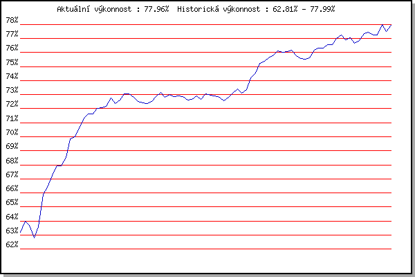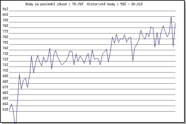 ZávodBodyVýkonnostZměna| 23.05.2012 | Obřany, 8.8 km | 63.19% | 63.19% | | | 30.05.2012 | Líšeň Mariánské údolí, 11 km | 64.31% | 63.97% | +0.78% | | 13.06.2012 | Pisárky Anthropos, 6 km | 63.25% | 63.68% | -0.29% | | 22.08.2012 | Líšeň Mariánské údolí, 11 km | 59.00% | 62.81% | -0.87% | | 12.09.2012 | Líšeň Mariánské údolí, 11 km | 64.15% | 63.58% | +0.77% | | 15.05.2013 | Pisárky Anthropos, 6 km | 69.71% | 65.89% | +2.31% | | 22.05.2013 | Palackého vrch, 7.1 km | 66.98% | 66.40% | +0.51% | | 29.05.2013 | Obřany, 8.8 km | 68.60% | 67.25% | +0.85% | | 05.06.2013 | Líšeň, 11 km | 68.92% | 67.93% | +0.68% | | 12.06.2013 | Popůvky, 7.3 km | 67.26% | 67.95% | +0.02% | | 19.06.2013 | Pisárky Anthropos, 6 km | 69.43% | 68.53% | +0.58% | | 14.05.2014 | Pisárky Anthropos, 6 km | 72.95% | 69.83% | +1.30% | | 21.05.2014 | Palackého vrch, 7.1 km | 69.91% | 69.99% | +0.16% | | 28.05.2014 | Obřany, 8.8 km | 71.66% | 70.57% | +0.58% | | 11.06.2014 | Popůvky, 7.9 km | 73.04% | 71.34% | +0.77% | | 18.06.2014 | Pisárky Anthropos, 6 km | 71.90% | 71.62% | +0.28% | | 25.06.2014 | Palackého vrch – Běh Olympijského dne | 71.19% | 71.63% | +0.01% | | 09.07.2014 | Popůvky, 7.9 km | 72.76% | 72.02% | +0.39% | | 16.07.2014 | Atletický stadión Pod Palackého vrche | 71.78% | 72.07% | +0.05% | | 23.07.2014 | Pisárky Anthropos, 6 km | 72.18% | 72.15% | +0.08% | | 30.07.2014 | Palackého vrch, 7.1 km | 74.32% | 72.75% | +0.60% | | 20.08.2014 | Líšeň, 11 km | 70.63% | 72.37% | -0.38% | | 10.09.2014 | Líšeň, 11 km | 73.11% | 72.64% | +0.27% | | 17.09.2014 | Pisárky Anthropos, 6 km | 73.94% | 73.07% | +0.43% | | 13.05.2015 | Pisárky Anthropos, 6 km | 72.64% | 73.05% | -0.02% | | 20.05.2015 | Palackého vrch, 7.1 km | 71.88% | 72.82% | -0.23% | | 27.05.2015 | Obřany, 8.8 km | 71.31% | 72.54% | -0.28% | | 03.06.2015 | Líšeň, 11 km | 71.73% | 72.40% | -0.14% | | 10.06.2015 | Popůvky, 7.9 km | 71.99% | 72.35% | -0.05% | | 17.06.2015 | Pisárky Anthropos, 6 km | 72.82% | 72.51% | +0.16% | | 24.06.2015 | Palackého vrch, 7.1 km | 73.83% | 72.88% | +0.37% | | 01.07.2015 | Obřany, 8.8 km | 73.70% | 73.14% | +0.26% | | 15.07.2015 | Atletický stadión Pod Palackého vrche | 71.35% | 72.82% | -0.32% | | 16.09.2015 | Pisárky Anthropos, 6 km | 73.31% | 73.01% | +0.19% | | 20.04.2016 | Atletický stadión Pod Palackého vrche | 71.98% | 72.84% | -0.17% | | 04.05.2016 | Líšeň, 11 km | 72.97% | 72.92% | +0.08% | | 11.05.2016 | Popůvky, 7.9 km | 72.50% | 72.86% | -0.06% | | 18.05.2016 | Palackého vrch, 7.1 km | 71.63% | 72.64% | -0.22% | | 25.05.2016 | Obřany, 8.8 km | 72.64% | 72.68% | +0.04% | | 01.06.2016 | Líšeň, 11 km | 73.41% | 72.92% | +0.24% | | 08.06.2016 | Popůvky, 7.9 km | 71.35% | 72.65% | -0.27% | | 15.06.2016 | Pisárky Anthropos, 6 km | 74.05% | 73.06% | +0.41% | | 22.06.2016 | Palackého vrch Běh Olympijského dne | 72.34% | 72.95% | -0.11% | | 20.07.2016 | Pisárky Anthropos, 6 km | 72.48% | 72.90% | -0.05% | | 03.08.2016 | Obřany, 8.8 km | 72.37% | 72.80% | -0.10% | | 17.08.2016 | Líšeň, 11 km | 71.36% | 72.57% | -0.23% | | 24.08.2016 | Popůvky, 7.9 km | 73.26% | 72.80% | +0.23% | | 31.08.2016 | Atletický stadión Pod Palackého vrche | 73.69% | 73.09% | +0.29% | | 26.04.2017 | Pisárky Anthropos, 6 km | 74.17% | 73.40% | +0.31% | | 10.05.2017 | Popůvky, 7.9 km | 71.89% | 73.12% | -0.28% | | 17.05.2017 | Palackého vrch, 7.1 km | 73.86% | 73.36% | +0.24% | | 31.05.2017 | Líšeň, 11 km | 76.33% | 74.19% | +0.83% | | 07.06.2017 | Pisárky Anthropos, 6 km | 75.21% | 74.55% | +0.36% | | 28.06.2017 | Obřany, 8.8 km | 76.83% | 75.23% | +0.68% | | 12.07.2017 | Atletický stadión Pod Palackého vrche | 75.40% | 75.38% | +0.15% | | 19.07.2017 | Pisárky Anthropos, 6 km | 76.07% | 75.64% | +0.26% | | 02.08.2017 | Líšeň, 11 km | 75.95% | 75.81% | +0.17% | | 09.08.2017 | Hotel Myslivna, 7 km | 76.75% | 76.13% | +0.32% | | 16.08.2017 | Obřany, 8.8 km | 75.40% | 76.01% | -0.12% | | 23.08.2017 | Popůvky, 7.9 km | 76.17% | 76.08% | +0.07% | | 06.09.2017 | Líšeň, 11 km | 76.25% | 76.16% | +0.08% | | 25.04.2018 | Atletický stadión Pod Palackého vrche | 72.03% | 75.76% | -0.40% | | 02.05.2018 | Hotel Myslivna, 7 km | 74.46% | 75.60% | -0.16% | | 09.05.2018 | Popůvky, 7.9 km | 75.04% | 75.52% | -0.08% | | 16.05.2018 | Palackého vrch, 7.1 km | 75.78% | 75.64% | +0.12% | | 23.05.2018 | Obřany, 8.8 km | 77.56% | 76.19% | +0.55% | | 06.06.2018 | Pisárky Anthropos, 6 km | 76.51% | 76.33% | +0.14% | | 13.06.2018 | Atletický stadión Pod Palackého vrche | 75.96% | 76.31% | -0.02% | | 20.06.2018 | Palackého vrch, 7.1 km | 77.04% | 76.54% | +0.23% | | 27.06.2018 | Popůvky, 7.9 km | 76.45% | 76.56% | +0.02% | | 18.07.2018 | Obřany, 8.8 km | 78.13% | 76.99% | +0.43% | | 25.07.2018 | Líšeň, 11 km | 77.92% | 77.28% | +0.29% | | 15.08.2018 | Popůvky, 7.9 km | 74.52% | 76.89% | -0.39% | | 12.09.2018 | Pisárky Anthropos, 6 km | 77.16% | 77.07% | +0.18% | | 17.04.2019 | Atletický stadión Pod Palackého vrche | 75.02% | 76.66% | -0.41% | | 24.04.2019 | Pisárky Anthropos, 6 km | 77.16% | 76.87% | +0.21% | | 22.05.2019 | Obřany, 8.8 km | 78.38% | 77.34% | +0.47% | | 29.05.2019 | Líšeň, 11 km | 77.31% | 77.44% | +0.10% | | 19.06.2019 | Atletický stadión Pod Palackého vrche | 76.34% | 77.24% | -0.20% | | 03.07.2019 | Obřany, 8.8 km | 77.06% | 77.24% | 0.00% | | 24.07.2019 | Líšeň, 11 km | 80.01% | 77.99% | +0.75% | | 01.07.2020 | Atletický stadión Pod Palackého vrche | 74.60% | 77.50% | -0.49% | | 15.07.2020 | Obřany, 8.8 km | 78.76% | 77.96% | +0.46% | | | | |