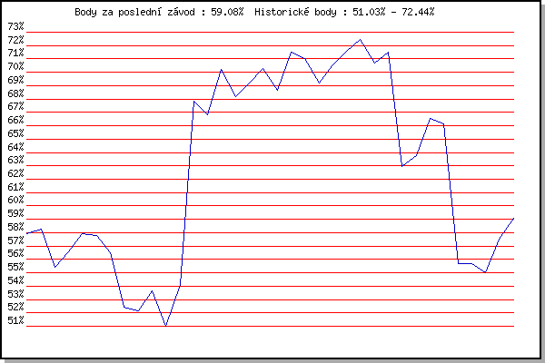 ZávodBodyVýkonnostZměna| 17.05.2006 | Pisárky Anthropos, 6.6 km | 57.90% | 57.90% | | | 31.05.2006 | Palackého vrch vodárna, 9 km | 58.28% | 58.16% | +0.26% | | 12.07.2006 | Obřany, 8.8 km | 55.44% | 57.42% | -0.74% | | 16.05.2007 | Pisárky Anthropos, 6.6 km | 56.59% | 57.24% | -0.18% | | 27.06.2007 | Obřany, 8.8 km | 57.90% | 57.60% | +0.36% | | 25.07.2007 | Pisárky Anthropos, 6.6 km | 57.76% | 57.72% | +0.12% | | 01.08.2007 | Obřany, 8.8 km | 56.47% | 57.42% | -0.30% | | 21.05.2008 | Obřany, 8.8 km | 52.40% | 56.89% | -0.53% | | 18.06.2008 | Obřany, 8.8 km | 52.15% | 55.87% | -1.02% | | 16.07.2008 | Pisárky Anthropos, 6.3 km | 53.63% | 55.45% | -0.42% | | 13.05.2009 | Pisárky Anthropos, 6.3 km | 51.03% | 54.73% | -0.72% | | 10.06.2009 | Pisárky Anthropos, 6.3 km | 54.10% | 54.72% | -0.01% | | 12.05.2010 | Pisárky Anthropos, 6.3 km | 67.87% | 58.61% | +3.89% | | 19.05.2010 | Palackého vrch , 7.1 km | 66.85% | 61.17% | +2.56% | | 26.05.2010 | Obřany, 8.8 km | 70.23% | 64.02% | +2.85% | | 02.06.2010 | Líšeň Mariánské údolí, 11.1 km | 68.19% | 65.60% | +1.58% | | 09.06.2010 | Veselka, Popůvky Vintrovna, 7.9 km | 69.18% | 67.07% | +1.47% | | 16.06.2010 | Pisárky Anthropos, 6.3 km | 70.28% | 68.44% | +1.37% | | 23.06.2010 | Palackého vrch Běh Olympijského dne | 68.62% | 68.97% | +0.53% | | 30.06.2010 | Obřany, 8.8 km | 71.47% | 69.72% | +0.75% | | 21.07.2010 | Moravská Slavia dráha, 5 km | 71.00% | 70.15% | +0.43% | | 28.07.2010 | Pisárky Anthropos, 6.3 km | 69.19% | 70.01% | -0.14% | | 04.08.2010 | Palackého vrch , 7.1 km | 70.53% | 70.21% | +0.20% | | 11.08.2010 | Obřany, 8.8 km | 71.57% | 70.63% | +0.42% | | 18.08.2010 | Moravská Slavia dráha, 10 km | 72.44% | 71.17% | +0.54% | | 01.09.2010 | Veselka, Popůvky Vintrovna, 7.9 km | 70.68% | 71.14% | -0.03% | | 08.09.2010 | Pisárky Anthropos, 6.3 km | 71.50% | 71.32% | +0.18% | | 11.05.2011 | Pisárky Anthropos, 6 km | 62.93% | 70.64% | -0.68% | | 18.05.2011 | Palackého vrch, 7.1 km | 63.74% | 69.33% | -1.31% | | 25.05.2011 | Obřany, 8.8 km | 66.57% | 68.92% | -0.41% | | 15.06.2011 | Pisárky Anthropos, 6 km | 66.15% | 68.49% | -0.43% | | 16.05.2012 | Palackého vrch, 7.1 km | 55.66% | 67.39% | -1.10% | | 23.05.2012 | Obřany, 8.8 km | 55.69% | 65.22% | -2.17% | | 06.06.2012 | Popůvky, 7.9 km | 55.03% | 63.42% | -1.80% | | 13.06.2012 | Pisárky Anthropos, 6 km | 57.55% | 62.38% | -1.04% | | 27.06.2012 | Obřany, 8.8 km | 59.08% | 61.90% | -0.48% | | | | |