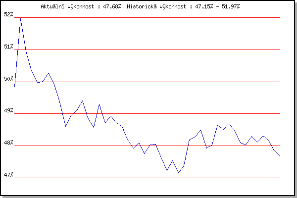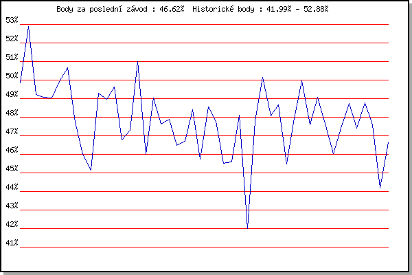 ZávodBodyVýkonnostZměna| 30.05.2012 | Líšeň Mariánské údolí, 11 km | 49.84% | 49.84% | | | 13.06.2012 | Pisárky Anthropos, 6 km | 52.88% | 51.97% | +2.13% | | 15.05.2013 | Pisárky Anthropos, 6 km | 49.21% | 50.95% | -1.02% | | 22.05.2013 | Palackého vrch, 7.1 km | 49.07% | 50.34% | -0.61% | | 29.05.2013 | Obřany, 8.8 km | 49.04% | 49.97% | -0.37% | | 05.06.2013 | Líšeň, 11 km | 49.91% | 50.01% | +0.04% | | 12.06.2013 | Popůvky, 7.3 km | 50.66% | 50.27% | +0.26% | | 26.06.2013 | Palackého vrch – Běh Olympijského dne | 47.75% | 49.92% | -0.35% | | 10.07.2013 | Popůvky, 7.3 km | 45.99% | 49.37% | -0.55% | | 31.07.2013 | Palackého vrch, 7.1 km | 45.15% | 48.60% | -0.77% | | 28.08.2013 | Popůvky, 7.3 km | 49.29% | 48.95% | +0.35% | | 11.09.2013 | Líšeň, 11 km | 48.97% | 49.11% | +0.16% | | 18.09.2013 | Pisárky Anthropos, 6 km | 49.64% | 49.40% | +0.29% | | 04.06.2014 | Líšeň, 11 km | 46.79% | 48.87% | -0.53% | | 25.06.2014 | Palackého vrch – Běh Olympijského dne | 47.28% | 48.57% | -0.30% | | 27.08.2014 | Popůvky, 5.3 km | 51.01% | 49.30% | +0.73% | | 10.09.2014 | Líšeň, 11 km | 46.01% | 48.71% | -0.59% | | 17.09.2014 | Pisárky Anthropos, 6 km | 49.02% | 48.93% | +0.22% | | 20.05.2015 | Palackého vrch, 7.1 km | 47.64% | 48.73% | -0.20% | | 27.05.2015 | Obřany, 8.8 km | 47.87% | 48.61% | -0.12% | | 10.06.2015 | Popůvky, 7.9 km | 46.48% | 48.21% | -0.40% | | 17.06.2015 | Pisárky Anthropos, 6 km | 46.71% | 47.92% | -0.29% | | 08.07.2015 | Popůvky, 7.9 km | 48.39% | 48.10% | +0.18% | | 26.08.2015 | Popůvky, 7.9 km | 45.74% | 47.75% | -0.35% | | 16.09.2015 | Pisárky Anthropos, 6 km | 48.56% | 48.04% | +0.29% | | 27.04.2016 | Pisárky Anthropos, 6 km | 47.77% | 48.05% | +0.01% | | 11.05.2016 | Popůvky, 7.9 km | 45.53% | 47.63% | -0.42% | | 01.06.2016 | Líšeň, 11 km | 45.61% | 47.23% | -0.40% | | 15.06.2016 | Pisárky Anthropos, 6 km | 48.11% | 47.54% | +0.31% | | 10.08.2016 | Hotel Myslivna, 7 km | 41.99% | 47.15% | -0.39% | | 24.08.2016 | Popůvky, 7.9 km | 47.80% | 47.39% | +0.24% | | 07.09.2016 | Pisárky Anthropos, 6 km | 50.14% | 48.19% | +0.80% | | 26.04.2017 | Pisárky Anthropos, 6 km | 48.08% | 48.28% | +0.09% | | 03.05.2017 | Hotel Myslivna, 7 km | 48.65% | 48.50% | +0.22% | | 10.05.2017 | Popůvky, 7.9 km | 45.50% | 47.93% | -0.57% | | 17.05.2017 | Palackého vrch, 7.1 km | 47.92% | 48.04% | +0.11% | | 14.06.2017 | Popůvky, 7.9 km | 49.96% | 48.65% | +0.61% | | 23.08.2017 | Popůvky, 7.9 km | 47.58% | 48.51% | -0.14% | | 13.09.2017 | Pisárky Anthropos, 6 km | 49.09% | 48.70% | +0.19% | | 06.06.2018 | Pisárky Anthropos, 6 km | 47.51% | 48.47% | -0.23% | | 20.06.2018 | Palackého vrch, 7.1 km | 46.04% | 48.10% | -0.37% | | 11.07.2018 | Hotel Myslivna, 7 km | 47.41% | 48.03% | -0.07% | | 17.04.2019 | Atletický stadión Pod Palackého vrche | 48.73% | 48.29% | +0.26% | | 24.04.2019 | Pisárky Anthropos, 6 km | 47.39% | 48.11% | -0.18% | | 15.05.2019 | Kociánka, 3.2 km | 48.78% | 48.31% | +0.20% | | 04.09.2019 | Hotel Myslivna, 7 km | 47.59% | 48.18% | -0.13% | | 09.06.2021 | Pisárky | 44.19% | 47.87% | -0.31% | | 04.08.2021 | Pisárky | 46.62% | 47.68% | -0.19% | | | | |