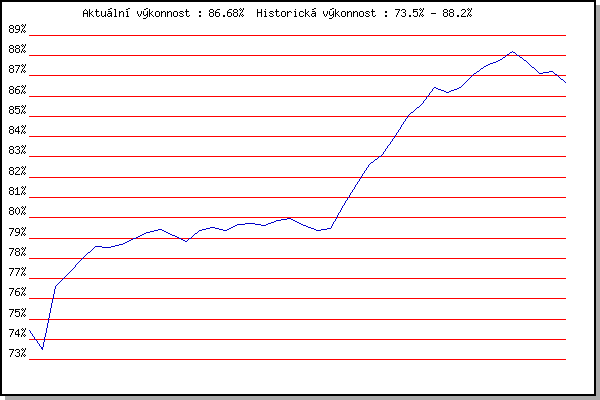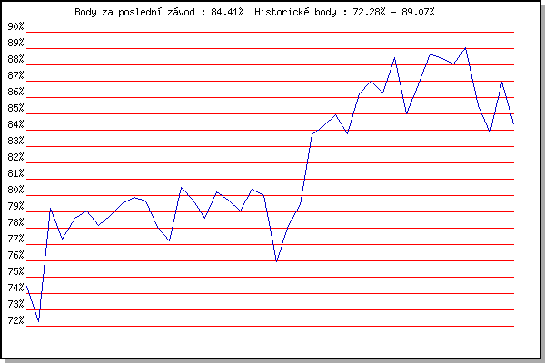 ZávodBodyVýkonnostZměna| 30.05.2012 | Líšeň Mariánské údolí, 11 km | 74.45% | 74.45% | | | 12.09.2012 | Líšeň Mariánské údolí, 11 km | 72.28% | 73.50% | -0.95% | | 14.05.2014 | Pisárky Anthropos, 6 km | 79.21% | 76.60% | +3.10% | | 21.05.2014 | Palackého vrch, 7.1 km | 77.34% | 77.27% | +0.67% | | 28.05.2014 | Obřany, 8.8 km | 78.60% | 78.00% | +0.73% | | 04.06.2014 | Líšeň, 11 km | 79.04% | 78.59% | +0.59% | | 11.06.2014 | Popůvky, 7.9 km | 78.18% | 78.54% | -0.05% | | 18.06.2014 | Pisárky Anthropos, 6 km | 78.78% | 78.68% | +0.14% | | 25.06.2014 | Palackého vrch – Běh Olympijského dne | 79.50% | 78.96% | +0.28% | | 02.07.2014 | Obřany, 8.8 km | 79.88% | 79.26% | +0.30% | | 09.07.2014 | Popůvky, 7.9 km | 79.64% | 79.42% | +0.16% | | 06.08.2014 | Obřany, 8.8 km | 78.05% | 79.14% | -0.28% | | 13.08.2014 | Atletický stadión Pod Palackého vrche | 77.20% | 78.84% | -0.30% | | 27.08.2014 | Popůvky, 5.3 km | 80.52% | 79.37% | +0.53% | | 03.09.2014 | Atletický stadión Pod Palackého vrche | 79.70% | 79.53% | +0.16% | | 20.05.2015 | Palackého vrch, 7.1 km | 78.61% | 79.37% | -0.16% | | 27.05.2015 | Obřany, 8.8 km | 80.22% | 79.65% | +0.28% | | 17.06.2015 | Pisárky Anthropos, 6 km | 79.73% | 79.72% | +0.07% | | 01.07.2015 | Obřany, 8.8 km | 79.07% | 79.61% | -0.11% | | 08.07.2015 | Popůvky, 7.9 km | 80.41% | 79.86% | +0.25% | | 15.07.2015 | Atletický stadión Pod Palackého vrche | 80.02% | 79.94% | +0.08% | | 05.08.2015 | Obřany, 8.8 km | 75.93% | 79.61% | -0.33% | | 12.08.2015 | Atletický stadión Pod Palackého vrche | 78.17% | 79.37% | -0.24% | | 26.08.2015 | Popůvky, 7.9 km | 79.47% | 79.45% | +0.08% | | 20.04.2016 | Atletický stadión Pod Palackého vrche | 83.72% | 80.60% | +1.15% | | 27.04.2016 | Pisárky Anthropos, 6 km | 84.25% | 81.65% | +1.05% | | 18.05.2016 | Palackého vrch, 7.1 km | 84.95% | 82.64% | +0.99% | | 25.05.2016 | Obřany, 8.8 km | 83.80% | 83.10% | +0.46% | | 01.06.2016 | Líšeň, 11 km | 86.24% | 84.07% | +0.97% | | 08.06.2016 | Popůvky, 7.9 km | 87.01% | 85.03% | +0.96% | | 15.06.2016 | Pisárky Anthropos, 6 km | 86.29% | 85.58% | +0.55% | | 22.06.2016 | Palackého vrch Běh Olympijského dne | 88.46% | 86.43% | +0.85% | | 29.06.2016 | Obřany, 8.8 km | 84.98% | 86.20% | -0.23% | | 13.07.2016 | Atletický stadión Pod Palackého vrche | 86.77% | 86.45% | +0.25% | | 20.07.2016 | Pisárky Anthropos, 6 km | 88.64% | 87.09% | +0.64% | | 27.07.2016 | Palackého vrch, 7.1 km | 88.40% | 87.52% | +0.43% | | 03.08.2016 | Obřany, 8.8 km | 88.06% | 87.78% | +0.26% | | 31.08.2016 | Atletický stadión Pod Palackého vrche | 89.07% | 88.20% | +0.42% | | 31.05.2017 | Líšeň, 11 km | 85.52% | 87.69% | -0.51% | | 12.07.2017 | Atletický stadión Pod Palackého vrche | 83.85% | 87.11% | -0.58% | | 30.08.2017 | Atletický stadión Pod Palackého vrche | 86.96% | 87.24% | +0.13% | | 22.05.2019 | Obřany, 8.8 km | 84.41% | 86.68% | -0.56% | | | | |