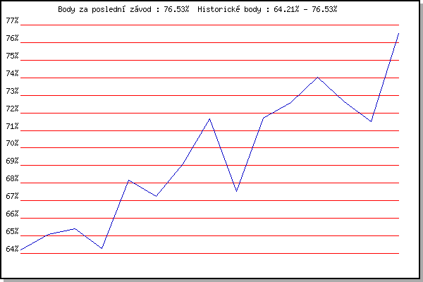 ZávodBodyVýkonnostZměna| 30.05.2012 | Líšeň Mariánské údolí, 11 km | 64.21% | 64.22% | | | 06.06.2012 | Popůvky, 7.9 km | 65.09% | 64.82% | +0.60% | | 13.06.2012 | Pisárky Anthropos, 6 km | 65.40% | 65.18% | +0.36% | | 20.06.2012 | Palackého vrch – Běh Olympijského dne | 64.30% | 64.88% | -0.30% | | 27.06.2012 | Obřany, 8.8 km | 68.17% | 66.17% | +1.29% | | 16.09.2015 | Pisárky Anthropos, 6 km | 67.26% | 66.66% | +0.49% | | 27.04.2016 | Pisárky Anthropos, 6 km | 69.08% | 67.58% | +0.92% | | 18.05.2016 | Palackého vrch, 7.1 km | 71.66% | 68.97% | +1.39% | | 25.05.2016 | Obřany, 8.8 km | 67.55% | 68.77% | -0.20% | | 15.06.2016 | Pisárky Anthropos, 6 km | 71.70% | 69.73% | +0.96% | | 29.06.2016 | Obřany, 8.8 km | 72.57% | 70.65% | +0.92% | | 13.07.2016 | Atletický stadión Pod Palackého vrche | 74.04% | 71.74% | +1.09% | | 27.07.2016 | Palackého vrch, 7.1 km | 72.63% | 72.19% | +0.45% | | 17.08.2016 | Líšeň, 11 km | 71.51% | 72.22% | +0.03% | | 09.08.2017 | Hotel Myslivna, 7 km | 76.53% | 73.50% | +1.28% | | | | |