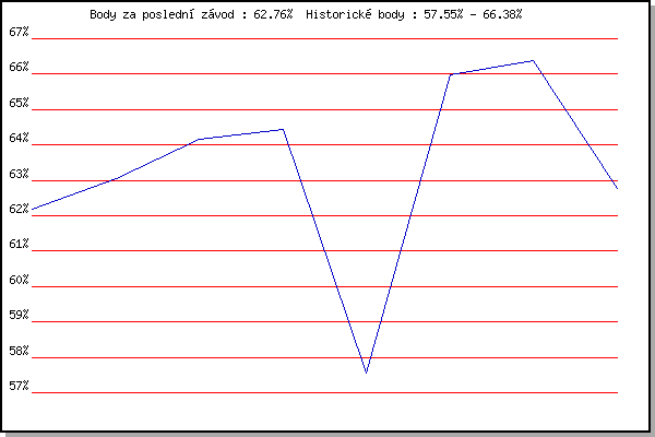 Závod| Body | Výkonnost | Změna | 31.05.2006 | Palackého vrch vodárna, 9 km | 62.19% | 62.19% | | 07.06.2006 | Líšeň Mariánské údolí, 11.1 km | 63.06% | 62.79% | +0.60% | 14.06.2006 | Veselka, Popůvky Vintrovna, 7.9 km | 64.17% | 63.56% | +0.77% | 28.06.2006 | Pisárky Anthropos, 6.6 km | 64.45% | 64.02% | +0.46% | 25.07.2006 | Veselka Popůvky Vintrovna, 7.9 km | 57.55% | 62.97% | -1.05% | 02.08.2006 | Pisárky Anthropos, 6.6 km | 65.97% | 64.34% | +1.37% | 09.08.2006 | Palackého vrch, 9 km | 66.38% | 65.19% | +0.85% | 30.08.2006 | Veselka Popůvky Vintrovna, 7.9 km | 62.76% | 64.63% | -0.56% | | |