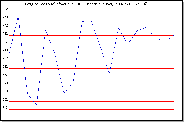 ZávodBodyVýkonnostZměna| 17.05.2006 | Pisárky Anthropos, 6.6 km | 70.80% | 70.80% | | | 24.05.2006 | Obřany, 8.8 km | 75.33% | 73.97% | +3.17% | | 31.05.2006 | Palackého vrch vodárna, 9 km | 65.91% | 71.48% | -2.49% | | 07.06.2006 | Líšeň Mariánské údolí, 11.1 km | 64.57% | 69.42% | -2.06% | | 22.06.2006 | Palackého vrch dráha, 5 km | 73.68% | 71.37% | +1.95% | | 02.08.2006 | Pisárky Anthropos, 6.6 km | 70.82% | 71.58% | +0.21% | | 16.08.2006 | Obřany, 8.8 km | 66.01% | 70.22% | -1.36% | | 30.05.2007 | Líšeň Mariánské údolí, 11.1 km | 67.28% | 69.61% | -0.61% | | 20.06.2007 | Palackého vrch Běh Olympijského dne | 74.70% | 71.31% | +1.70% | | 27.06.2007 | Obřany, 8.8 km | 74.76% | 72.57% | +1.26% | | 16.07.2008 | Pisárky Anthropos, 6.3 km | 71.58% | 72.61% | +0.04% | | 18.08.2010 | Moravská Slavia dráha, 10 km | 68.35% | 71.77% | -0.84% | | 08.09.2010 | Pisárky Anthropos, 6.3 km | 73.91% | 72.54% | +0.77% | | 23.06.2011 | Palackého vrch – Běh Olympijského dne | 71.93% | 72.59% | +0.05% | | 29.06.2011 | Obřany, 8.8 km | 73.56% | 73.05% | +0.46% | | 13.07.2011 | Popůvky, 7.9 km | 73.95% | 73.44% | +0.39% | | 09.05.2012 | Pisárky Anthropos, 6 km | 72.84% | 73.38% | -0.06% | | 13.05.2015 | Pisárky Anthropos, 6 km | 72.18% | 73.16% | -0.22% | | 27.05.2015 | Obřany, 8.8 km | 73.01% | 73.18% | +0.02% | | | | |