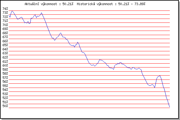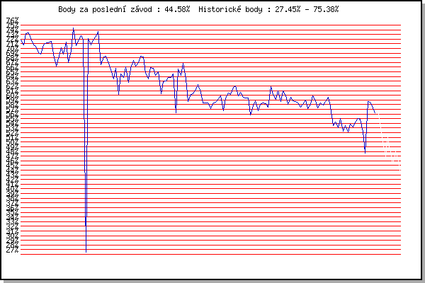 ZávodBodyVýkonnostZměna| 17.05.2006 | Pisárky Anthropos, 6.6 km | 72.80% | 72.80% | | | 24.05.2006 | Obřany, 8.8 km | 71.75% | 72.34% | -0.46% | | 31.05.2006 | Palackého vrch vodárna, 9 km | 74.12% | 73.31% | +0.97% | | 07.06.2006 | Líšeň Mariánské údolí, 11.1 km | 74.36% | 73.89% | +0.58% | | 14.06.2006 | Veselka, Popůvky Vintrovna, 7.9 km | 73.18% | 73.72% | -0.17% | | 28.06.2006 | Pisárky Anthropos, 6.6 km | 71.81% | 73.25% | -0.47% | | 12.07.2006 | Obřany, 8.8 km | 71.42% | 72.86% | -0.39% | | 25.07.2006 | Veselka Popůvky Vintrovna, 7.9 km | 70.07% | 72.45% | -0.41% | | 02.08.2006 | Pisárky Anthropos, 6.6 km | 69.72% | 71.89% | -0.56% | | 09.08.2006 | Palackého vrch, 9 km | 71.71% | 71.95% | +0.06% | | 16.08.2006 | Obřany, 8.8 km | 72.25% | 72.13% | +0.18% | | 23.08.2006 | Líšeň Mariánské údolí, 11.1 km | 72.23% | 72.26% | +0.13% | | 30.08.2006 | Veselka Popůvky Vintrovna, 7.9 km | 72.53% | 72.38% | +0.12% | | 30.05.2007 | Líšeň Mariánské údolí, 11.1 km | 69.73% | 71.93% | -0.45% | | 18.07.2007 | Moravská Slávia dráha, 15 km | 67.23% | 71.46% | -0.47% | | 25.07.2007 | Pisárky Anthropos, 6.6 km | 68.90% | 70.95% | -0.51% | | 01.08.2007 | Obřany, 8.8 km | 71.19% | 71.11% | +0.16% | | 08.08.2007 | Líšeň Mariánské údolí, 11.1 km | 69.76% | 70.88% | -0.23% | | 15.08.2007 | Moravská Slávia dráha, 10 km | 72.37% | 71.35% | +0.47% | | 22.08.2007 | Veselka, Popůvky Vintrovna, 7.9 km | 68.03% | 70.80% | -0.55% | | 28.09.2007 | Blažovice Svatováclavský běh, 11 km | 70.54% | 70.87% | +0.07% | | 21.05.2008 | Obřany, 8.8 km | 75.38% | 72.14% | +1.27% | | 18.06.2008 | Obřany, 8.8 km | 71.65% | 72.16% | +0.02% | | 25.06.2008 | Běh Olympijského dne, 7.1 km | 72.52% | 72.37% | +0.21% | | 02.07.2008 | Líšeň Mariánské údolí, 11.1 km | 73.78% | 72.84% | +0.47% | | 09.07.2008 | Veselka, Popůvky Vintrovna, 7.9 km | 72.85% | 72.95% | +0.11% | | 23.07.2008 | Moravská Slavia , 15 km | 27.45% | 72.20% | -0.75% | | 30.07.2008 | Obřany, 8.8 km | 73.11% | 72.66% | +0.46% | | 06.08.2008 | Líšeň Mariánské údolí, 11.1 km | 71.77% | 72.59% | -0.07% | | 13.08.2008 | Veselka, Popůvky Vintrovna, 7.9 km | 72.82% | 72.75% | +0.16% | | 20.08.2008 | Moravská Slavia dráha, 10 km | 73.56% | 73.01% | +0.26% | | 28.09.2008 | Blažovice Svatováclavský běh, 11 km | 74.69% | 73.49% | +0.48% | | 13.05.2009 | Pisárky Anthropos, 6.3 km | 67.57% | 72.75% | -0.74% | | 10.06.2009 | Pisárky Anthropos, 6.3 km | 69.22% | 72.13% | -0.62% | | 28.09.2009 | Blažovice Svatováclavský běh, 11 km | 69.41% | 71.62% | -0.51% | | 12.05.2010 | Pisárky Anthropos, 6.3 km | 67.77% | 70.92% | -0.70% | | 02.06.2010 | Líšeň Mariánské údolí, 11.1 km | 66.43% | 70.24% | -0.68% | | 09.06.2010 | Veselka, Popůvky Vintrovna, 7.9 km | 64.51% | 69.46% | -0.78% | | 16.06.2010 | Pisárky Anthropos, 6.3 km | 66.78% | 68.98% | -0.48% | | 14.07.2010 | Veselka, Popůvky Vintrovna, 7.9 km | 61.17% | 68.11% | -0.87% | | 21.07.2010 | Moravská Slavia dráha, 5 km | 65.55% | 67.69% | -0.42% | | 28.07.2010 | Pisárky Anthropos, 6.3 km | 64.84% | 67.15% | -0.54% | | 04.08.2010 | Palackého vrch , 7.1 km | 67.04% | 67.24% | +0.09% | | 11.08.2010 | Obřany, 8.8 km | 63.81% | 66.63% | -0.61% | | 18.08.2010 | Moravská Slavia dráha, 10 km | 66.76% | 66.81% | +0.18% | | 25.08.2010 | Líšeň Mariánské údolí, 11.1 km | 68.43% | 67.35% | +0.54% | | 01.09.2010 | Veselka, Popůvky Vintrovna, 7.9 km | 67.27% | 67.45% | +0.10% | | 08.09.2010 | Pisárky Anthropos, 6.3 km | 67.98% | 67.71% | +0.26% | | 28.09.2010 | Blažovice Svatováclavský běh, 9.4 km | 69.30% | 68.20% | +0.49% | | 09.10.2010 | Mizuno sedmička, 7 km | 69.20% | 68.52% | +0.32% | | 11.05.2011 | Pisárky Anthropos, 6 km | 65.74% | 68.02% | -0.50% | | 18.05.2011 | Palackého vrch, 7.1 km | 64.45% | 67.45% | -0.57% | | 25.05.2011 | Obřany, 8.8 km | 66.96% | 67.48% | +0.03% | | 01.06.2011 | Líšeň Mariánské údolí, 11.1 km | 66.70% | 67.39% | -0.09% | | 08.06.2011 | Veselka, Popůvky Vintrovna, 7.9 km | 65.30% | 66.99% | -0.40% | | 15.06.2011 | Pisárky Anthropos, 6 km | 66.08% | 66.85% | -0.14% | | 29.06.2011 | Obřany, 8.8 km | 61.28% | 66.42% | -0.43% | | 13.07.2011 | Popůvky, 7.9 km | 63.96% | 65.95% | -0.47% | | 27.07.2011 | Pisárky Anthropos, 6 km | 64.01% | 65.57% | -0.38% | | 03.08.2011 | Palackého vrch, 7.1 km | 64.82% | 65.46% | -0.11% | | 10.08.2011 | Obřany, 8.8 km | 64.73% | 65.35% | -0.11% | | 17.08.2011 | AC Moravská Slávia, 10km atletický | 65.53% | 65.47% | +0.12% | | 24.08.2011 | Líšeň Mariánské údolí, 11.1 km | 57.25% | 64.99% | -0.48% | | 31.08.2011 | Popůvky, 7.9 km | 66.57% | 65.57% | +0.58% | | 07.09.2011 | Pisárky Anthropos, 6 km | 65.24% | 65.57% | 0.00% | | 14.09.2011 | Líšeň Mariánské údolí, 11.1 km | 67.81% | 66.22% | +0.65% | | 28.09.2011 | Blažovice – Svatováclavský běh , 11 k | 64.45% | 65.87% | -0.35% | | 09.05.2012 | Pisárky Anthropos, 6 km | 59.59% | 65.12% | -0.75% | | 16.05.2012 | Palackého vrch, 7.1 km | 61.24% | 64.44% | -0.68% | | 30.05.2012 | Líšeň Mariánské údolí, 11 km | 61.38% | 63.87% | -0.57% | | 06.06.2012 | Popůvky, 7.9 km | 62.28% | 63.60% | -0.27% | | 13.06.2012 | Pisárky Anthropos, 6 km | 63.29% | 63.64% | +0.04% | | 14.05.2014 | Pisárky Anthropos, 6 km | 61.64% | 63.26% | -0.38% | | 21.05.2014 | Palackého vrch, 7.1 km | 59.31% | 62.72% | -0.54% | | 28.05.2014 | Obřany, 8.8 km | 59.32% | 62.06% | -0.66% | | 04.06.2014 | Líšeň, 11 km | 59.32% | 61.52% | -0.54% | | 11.06.2014 | Popůvky, 7.9 km | 58.19% | 61.07% | -0.45% | | 25.06.2014 | Palackého vrch – Běh Olympijského dne | 59.35% | 60.75% | -0.32% | | 02.07.2014 | Obřany, 8.8 km | 59.51% | 60.51% | -0.24% | | 16.07.2014 | Atletický stadión Pod Palackého vrche | 60.24% | 60.50% | -0.01% | | 23.07.2014 | Pisárky Anthropos, 6 km | 60.93% | 60.66% | +0.16% | | 30.07.2014 | Palackého vrch, 7.1 km | 57.67% | 60.30% | -0.36% | | 06.08.2014 | Obřany, 8.8 km | 60.45% 