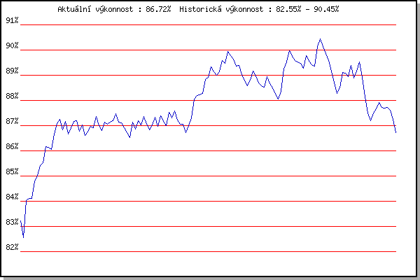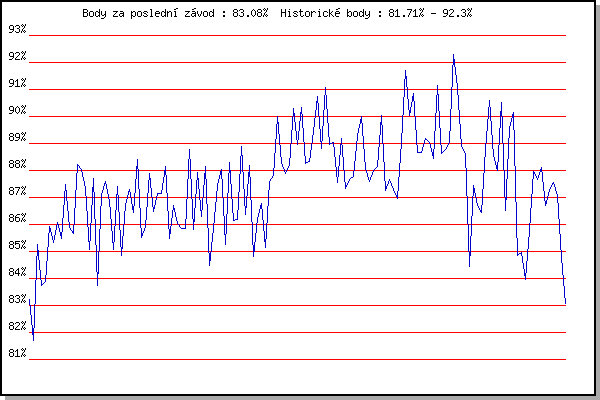 ZávodBodyVýkonnostZměna| 20.06.2012 | Palackého vrch – Běh Olympijského dne | 83.22% | 83.22% | | | 27.06.2012 | Obřany, 8.8 km | 81.71% | 82.55% | -0.67% | | 11.07.2012 | Popůvky, 7.9 km | 85.25% | 84.03% | +1.48% | | 08.08.2012 | Obřany, 8.8 km | 83.75% | 84.10% | +0.07% | | 22.08.2012 | Líšeň Mariánské údolí, 11 km | 83.90% | 84.12% | +0.02% | | 29.08.2012 | Pisárky Anthropos, 6 km | 85.93% | 84.79% | +0.67% | | 05.09.2012 | Popůvky, 7.9 km | 85.35% | 85.04% | +0.25% | | 12.09.2012 | Líšeň Mariánské údolí, 11 km | 86.09% | 85.43% | +0.39% | | 15.05.2013 | Pisárky Anthropos, 6 km | 85.48% | 85.53% | +0.10% | | 22.05.2013 | Palackého vrch, 7.1 km | 87.47% | 86.17% | +0.64% | | 29.05.2013 | Obřany, 8.8 km | 85.88% | 86.14% | -0.03% | | 05.06.2013 | Líšeň, 11 km | 85.68% | 86.06% | -0.08% | | 12.06.2013 | Popůvky, 7.3 km | 88.22% | 86.67% | +0.61% | | 19.06.2013 | Pisárky Anthropos, 6 km | 88.04% | 87.09% | +0.42% | | 26.06.2013 | Palackého vrch – Běh Olympijského dne | 87.35% | 87.24% | +0.15% | | 03.07.2013 | Obřany, 8.8 km | 85.06% | 86.84% | -0.40% | | 10.07.2013 | Popůvky, 7.3 km | 87.71% | 87.16% | +0.32% | | 17.07.2013 | Atletický stadión Pod Palackého vrche | 83.73% | 86.68% | -0.48% | | 24.07.2013 | Pisárky Anthropos, 6 km | 87.10% | 86.91% | +0.23% | | 31.07.2013 | Palackého vrch, 7.1 km | 87.60% | 87.18% | +0.27% | | 07.08.2013 | Obřany, 8.8 km | 86.84% | 87.20% | +0.02% | | 21.08.2013 | Líšeň, 11 km | 85.07% | 86.78% | -0.42% | | 28.08.2013 | Popůvky, 7.3 km | 87.42% | 87.02% | +0.24% | | 04.09.2013 | Atletický stadión Pod Palackého vrche | 84.87% | 86.62% | -0.40% | | 11.09.2013 | Líšeň, 11 km | 86.73% | 86.74% | +0.12% | | 18.09.2013 | Pisárky Anthropos, 6 km | 87.31% | 86.96% | +0.22% | | 14.05.2014 | Pisárky Anthropos, 6 km | 86.45% | 86.93% | -0.03% | | 21.05.2014 | Palackého vrch, 7.1 km | 88.39% | 87.36% | +0.43% | | 28.05.2014 | Obřany, 8.8 km | 85.52% | 87.01% | -0.35% | | 04.06.2014 | Líšeň, 11 km | 85.91% | 86.80% | -0.21% | | 11.06.2014 | Popůvky, 7.9 km | 87.89% | 87.14% | +0.34% | | 18.06.2014 | Pisárky Anthropos, 6 km | 86.49% | 87.05% | -0.09% | | 25.06.2014 | Palackého vrch – Běh Olympijského dne | 87.14% | 87.13% | +0.08% | | 02.07.2014 | Obřany, 8.8 km | 87.13% | 87.19% | +0.06% | | 09.07.2014 | Popůvky, 7.9 km | 88.13% | 87.46% | +0.27% | | 16.07.2014 | Atletický stadión Pod Palackého vrche | 85.49% | 87.14% | -0.32% | | 23.07.2014 | Pisárky Anthropos, 6 km | 86.72% | 87.11% | -0.03% | | 06.08.2014 | Obřany, 8.8 km | 86.04% | 86.91% | -0.20% | | 13.08.2014 | Atletický stadión Pod Palackého vrche | 85.86% | 86.71% | -0.20% | | 20.08.2014 | Líšeň, 11 km | 85.85% | 86.53% | -0.18% | | 27.08.2014 | Popůvky, 5.3 km | 88.77% | 87.13% | +0.60% | | 03.09.2014 | Atletický stadión Pod Palackého vrche | 85.81% | 86.87% | -0.26% | | 17.09.2014 | Pisárky Anthropos, 6 km | 87.92% | 87.19% | +0.32% | | 13.05.2015 | Pisárky Anthropos, 6 km | 86.28% | 87.03% | -0.16% | | 20.05.2015 | Palackého vrch, 7.1 km | 88.13% | 87.37% | +0.34% | | 27.05.2015 | Obřany, 8.8 km | 84.50% | 87.05% | -0.32% | | 03.06.2015 | Líšeň, 11 km | 85.87% | 86.83% | -0.22% | | 10.06.2015 | Popůvky, 7.9 km | 87.46% | 87.03% | +0.20% | | 24.06.2015 | Palackého vrch, 7.1 km | 88.02% | 87.34% | +0.31% | | 01.07.2015 | Obřany, 8.8 km | 85.27% | 86.98% | -0.36% | | 08.07.2015 | Popůvky, 7.9 km | 88.29% | 87.40% | +0.42% | | 15.07.2015 | Atletický stadión Pod Palackého vrche | 86.16% | 87.18% | -0.22% | | 22.07.2015 | Pisárky Anthropos, 6 km | 86.17% | 86.99% | -0.19% | | 29.07.2015 | Palackého vrch, 7.1 km | 88.88% | 87.53% | +0.54% | | 19.08.2015 | Líšeň, 10.6 km | 86.36% | 87.30% | -0.23% | | 26.08.2015 | Popůvky, 7.9 km | 88.18% | 87.58% | +0.28% | | 02.09.2015 | Atletický stadión Pod Palackého vrche | 84.81% | 87.21% | -0.37% | | 09.09.2015 | Líšeň, 11 km | 86.21% | 87.06% | -0.15% | | 16.09.2015 | Pisárky Anthropos, 6 km | 86.79% | 87.06% | 0.00% | | 20.04.2016 | Atletický stadión Pod Palackého vrche | 85.15% | 86.71% | -0.35% | | 27.04.2016 | Pisárky Anthropos, 6 km | 87.60% | 87.01% | +0.30% | | 04.05.2016 | Líšeň, 11 km | 87.81% | 87.30% | +0.29% | | 11.05.2016 | Popůvky, 7.9 km | 89.98% | 88.05% | +0.75% | | 18.05.2016 | Palackého vrch, 7.1 km | 88.30% | 88.20% | +0.15% | | 25.05.2016 | Obřany, 8.8 km | 87.88% | 88.22% | +0.02% | | 01.06.2016 | Líšeň, 11 km | 88.20% | 88.29% | +0.07% | | 08.06.2016 | Popůvky, 7.9 km | 90.30% | 88.84% | +0.55% | | 15.06.2016 | Pisárky Anthropos, 6 km | 88.96% | 88.92% | +0.08% | | 22.06.2016 | Palackého vrch Běh Olympijského dne | 90.34% | 89.34% | +0.42% | | 29.06.2016 | Obřany, 8.8 km | 88.27% | 89.14% | -0.20% | | 13.07.2016 | Atletický stadión Pod Palackého vrche | 88.33% | 88.99% | -0.15% | | 20.07.2016 | Pisárky Anthropos, 6 km | 89.44% | 89.14% | +0.15% | | 27.07.2016 | Palackého vrch, 7.1 km | 90.75% | 89.59% | +0.45% | | 03.08.2016 | Obřany, 8.8 km | 88.83% | 89.47% | -0.12% | | 10.08.2016 | Hotel Myslivna, 7 km | 91.09% | 89.93% | +0.46% | | 17.08.2016 | Líšeň, 11 km | 88.98% | 89.77% | -0.16% | | 07.09.2016 | Pisárky Anthropos, 6 km | 89.05% | 89.65% | -0.12% | | 26.04.2017 | Pisárky Anthropos, 6 km | 87.55% | 89.36% | -0.29% | | 17.05.2017 | Palackého vrch, 7.1 km | 89.19% | 89.40% | +0.04% | | 24.05.2017 | Obřany, 8.8 km | 87.34% | 89.04% | -0.36% | | 31.05.2017 | Líšeň, 11 km | 87.66% | 88.77% | -0.27% | | 07.06.2017 | Pisárky Anthropos, 6 km | 87.76% | 88.58% | -0.19% | | 14.06.2017 | Popůvky, 7.9 km | 89.31% | 88.81% | +0.23% | | 21.06.2017 | Palackého vrch, 7.1 km | 90.00% | 89.17% | +0.36% | | 28.06.2017 | Obřany, 8.8 km | 88.09% | 88.97% | -0.20% | | 12.07.2017 | Atletický stadión Pod Palackého vrche | 87.58% | 88.70% | -0.27% | | 19.07.2017 | Pisárky Anthropos, 6 km | 88.01% | 88.59% | -0.11% | | 02.08.2017 | Líšeň, 11 km | 88.13% | 88.52% | -0.07% | | 09.08.2017 | Hotel Myslivna, 7 km 