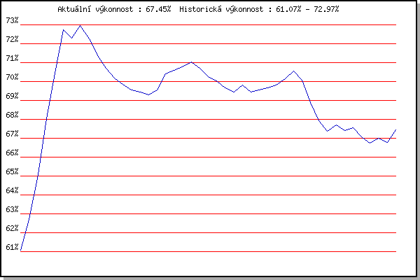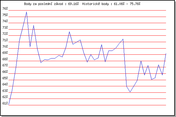 ZávodBodyVýkonnostZměna| 20.06.2012 | Palackého vrch – Běh Olympijského dne | 61.08% | 61.07% | | | 27.06.2012 | Obřany, 8.8 km | 63.39% | 62.69% | +1.62% | | 11.07.2012 | Popůvky, 7.9 km | 67.00% | 65.09% | +2.40% | | 08.08.2012 | Obřany, 8.8 km | 71.33% | 68.05% | +2.96% | | 22.08.2012 | Líšeň Mariánské údolí, 11 km | 73.45% | 70.43% | +2.38% | | 29.08.2012 | Pisárky Anthropos, 6 km | 75.78% | 72.73% | +2.30% | | 05.09.2012 | Popůvky, 7.9 km | 70.22% | 72.30% | -0.43% | | 28.09.2012 | Blažovice – Svatováclavský běh, 11 km | 73.64% | 72.97% | +0.67% | | 05.06.2013 | Líšeň, 11 km | 69.84% | 72.26% | -0.71% | | 12.06.2013 | Popůvky, 7.3 km | 67.71% | 71.38% | -0.88% | | 19.06.2013 | Pisárky Anthropos, 6 km | 68.21% | 70.72% | -0.66% | | 26.06.2013 | Palackého vrch – Běh Olympijského dne | 68.16% | 70.20% | -0.52% | | 10.07.2013 | Popůvky, 7.3 km | 68.41% | 69.84% | -0.36% | | 24.07.2013 | Pisárky Anthropos, 6 km | 68.39% | 69.56% | -0.28% | | 31.07.2013 | Palackého vrch, 7.1 km | 68.89% | 69.46% | -0.10% | | 07.08.2013 | Obřany, 8.8 km | 68.62% | 69.30% | -0.16% | | 14.08.2013 | Atletický stadión Pod Palackého vrche | 70.14% | 69.57% | +0.27% | | 11.09.2013 | Líšeň, 11 km | 72.61% | 70.41% | +0.84% | | 18.09.2013 | Pisárky Anthropos, 6 km | 70.64% | 70.58% | +0.17% | | 28.09.2013 | Blažovice – Svatováclavský běh, 11 km | 70.95% | 70.77% | +0.19% | | 28.05.2014 | Obřany, 8.8 km | 71.33% | 71.02% | +0.25% | | 04.06.2014 | Líšeň, 11 km | 69.27% | 70.70% | -0.32% | | 11.06.2014 | Popůvky, 7.9 km | 67.79% | 70.24% | -0.46% | | 18.06.2014 | Pisárky Anthropos, 6 km | 69.03% | 70.05% | -0.19% | | 25.06.2014 | Palackého vrch – Běh Olympijského dne | 68.19% | 69.68% | -0.37% | | 02.07.2014 | Obřany, 8.8 km | 68.44% | 69.45% | -0.23% | | 09.07.2014 | Popůvky, 7.9 km | 70.60% | 69.80% | +0.35% | | 23.07.2014 | Pisárky Anthropos, 6 km | 67.84% | 69.45% | -0.35% | | 30.07.2014 | Palackého vrch, 7.1 km | 69.62% | 69.57% | +0.12% | | 06.08.2014 | Obřany, 8.8 km | 69.63% | 69.66% | +0.09% | | 27.08.2014 | Popůvky, 5.3 km | 70.05% | 69.83% | +0.17% | | 10.09.2014 | Líšeň, 11 km | 70.82% | 70.15% | +0.32% | | 17.09.2014 | Pisárky Anthropos, 6 km | 71.44% | 70.54% | +0.39% | | 03.06.2015 | Líšeň, 11 km | 63.98% | 70.07% | -0.47% | | 17.06.2015 | Pisárky Anthropos, 6 km | 63.08% | 68.90% | -1.17% | | 26.08.2015 | Popůvky, 7.9 km | 63.95% | 67.93% | -0.97% | | 28.09.2015 | Blažovice – Svatováclavský běh, 11 km | 64.88% | 67.38% | -0.55% | | 04.05.2016 | Líšeň, 11 km | 68.01% | 67.71% | +0.33% | | 08.06.2016 | Popůvky, 7.9 km | 65.78% | 67.41% | -0.30% | | 15.06.2016 | Pisárky Anthropos, 6 km | 67.28% | 67.54% | +0.13% | | 27.07.2016 | Palackého vrch, 7.1 km | 65.07% | 67.07% | -0.47% | | 03.08.2016 | Obřany, 8.8 km | 65.31% | 66.74% | -0.33% | | 03.05.2017 | Hotel Myslivna, 7 km | 67.41% | 66.99% | +0.25% | | 17.05.2017 | Palackého vrch, 7.1 km | 65.75% | 66.78% | -0.21% | | 31.05.2017 | Líšeň, 11 km | 69.16% | 67.45% | +0.67% | | | | |