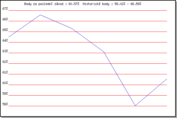 Závod| Body | Výkonnost | Změna | 27.06.2012 | Obřany, 8.8 km | 64.51% | 64.51% | | 11.07.2012 | Popůvky, 7.9 km | 66.59% | 65.96% | +1.45% | 18.07.2012 | Atletický stadión Pod Palackého vrche | 65.31% | 65.78% | -0.18% | 25.07.2012 | Pisárky Anthropos, 6 km | 63.11% | 65.12% | -0.66% | 24.07.2013 | Pisárky Anthropos, 6 km | 58.02% | 63.94% | -1.18% | 22.07.2015 | Pisárky Anthropos, 6 km | 60.57% | 63.21% | -0.73% | | |
