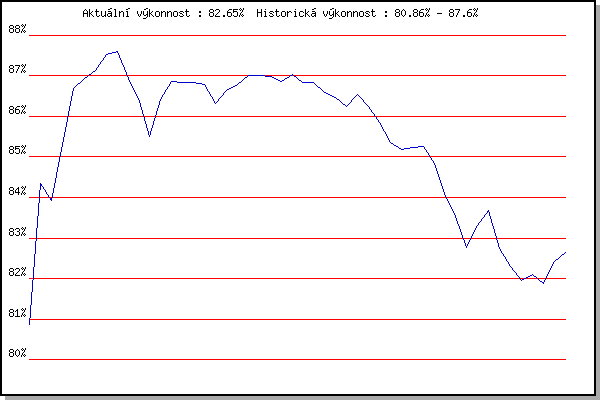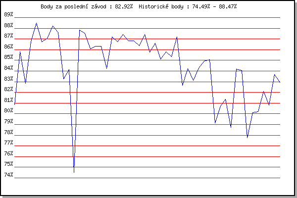 ZávodBodyVýkonnostZměna| 27.06.2012 | Obřany, 8.8 km | 80.86% | 80.86% | | | 11.07.2012 | Popůvky, 7.9 km | 85.82% | 84.34% | +3.48% | | 18.07.2012 | Atletický stadión Pod Palackého vrche | 82.85% | 83.93% | -0.41% | | 25.07.2012 | Pisárky Anthropos, 6 km | 86.71% | 85.31% | +1.38% | | 01.08.2012 | Palackého vrch, 7.1 km | 88.47% | 86.68% | +1.37% | | 15.08.2012 | Atletický stadión Pod Palackého vrche | 86.72% | 86.94% | +0.26% | | 22.08.2012 | Líšeň Mariánské údolí, 11 km | 87.06% | 87.13% | +0.19% | | 29.08.2012 | Pisárky Anthropos, 6 km | 88.20% | 87.52% | +0.39% | | 05.09.2012 | Popůvky, 7.9 km | 87.63% | 87.60% | +0.08% | | 15.05.2013 | Pisárky Anthropos, 6 km | 83.25% | 86.93% | -0.67% | | 29.05.2013 | Obřany, 8.8 km | 84.15% | 86.38% | -0.55% | | 05.06.2013 | Líšeň, 11 km | 74.49% | 85.50% | -0.88% | | 12.06.2013 | Popůvky, 7.3 km | 87.86% | 86.41% | +0.91% | | 26.06.2013 | Palackého vrch – Běh Olympijského dne | 87.51% | 86.86% | +0.45% | | 10.07.2013 | Popůvky, 7.3 km | 86.07% | 86.84% | -0.02% | | 24.07.2013 | Pisárky Anthropos, 6 km | 86.33% | 86.84% | 0.00% | | 07.08.2013 | Obřany, 8.8 km | 86.29% | 86.79% | -0.05% | | 14.08.2013 | Atletický stadión Pod Palackého vrche | 84.23% | 86.31% | -0.48% | | 21.08.2013 | Líšeň, 11 km | 87.17% | 86.64% | +0.33% | | 28.08.2013 | Popůvky, 7.3 km | 86.75% | 86.78% | +0.14% | | 11.09.2013 | Líšeň, 11 km | 87.40% | 87.01% | +0.23% | | 14.05.2014 | Pisárky Anthropos, 6 km | 86.83% | 87.01% | 0.00% | | 21.05.2014 | Palackého vrch, 7.1 km | 86.80% | 86.99% | -0.02% | | 04.06.2014 | Líšeň, 11 km | 86.38% | 86.87% | -0.12% | | 25.06.2014 | Palackého vrch – Běh Olympijského dne | 87.41% | 87.03% | +0.16% | | 02.07.2014 | Obřany, 8.8 km | 85.76% | 86.84% | -0.19% | | 09.07.2014 | Popůvky, 7.9 km | 86.61% | 86.84% | 0.00% | | 23.07.2014 | Pisárky Anthropos, 6 km | 85.13% | 86.60% | -0.24% | | 06.08.2014 | Obřany, 8.8 km | 85.82% | 86.47% | -0.13% | | 20.08.2014 | Líšeň, 11 km | 85.34% | 86.24% | -0.23% | | 27.08.2014 | Popůvky, 5.3 km | 87.18% | 86.53% | +0.29% | | 13.05.2015 | Pisárky Anthropos, 6 km | 82.66% | 86.24% | -0.29% | | 20.05.2015 | Palackého vrch, 7.1 km | 84.21% | 85.84% | -0.40% | | 27.05.2015 | Obřany, 8.8 km | 83.12% | 85.35% | -0.49% | | 03.06.2015 | Líšeň, 11 km | 84.26% | 85.19% | -0.16% | | 17.06.2015 | Pisárky Anthropos, 6 km | 84.94% | 85.23% | +0.04% | | 29.07.2015 | Palackého vrch, 7.1 km | 85.07% | 85.25% | +0.02% | | 26.04.2017 | Pisárky Anthropos, 6 km | 79.12% | 84.83% | -0.42% | | 03.05.2017 | Hotel Myslivna, 7 km | 80.70% | 84.02% | -0.81% | | 31.05.2017 | Líšeň, 11 km | 81.34% | 83.52% | -0.50% | | 14.06.2017 | Popůvky, 7.9 km | 78.71% | 82.77% | -0.75% | | 21.06.2017 | Palackého vrch, 7.1 km | 84.19% | 83.30% | +0.53% | | 19.07.2017 | Pisárky Anthropos, 6 km | 84.03% | 83.68% | +0.38% | | 17.04.2019 | Atletický stadión Pod Palackého vrche | 77.77% | 82.75% | -0.93% | | 24.04.2019 | Pisárky Anthropos, 6 km | 80.12% | 82.29% | -0.46% | | 29.05.2019 | Líšeň, 11 km | 80.19% | 81.95% | -0.34% | | 05.06.2019 | Palackého vrch, 7.1 km | 82.10% | 82.10% | +0.15% | | 17.07.2019 | Palackého vrch, 7.1 km | 80.79% | 81.87% | -0.23% | | 11.09.2019 | Pisárky Anthropos, 6 km | 83.66% | 82.41% | +0.54% | | 01.07.2020 | Atletický stadión Pod Palackého vrche | 82.92% | 82.65% | +0.24% | | | | |
