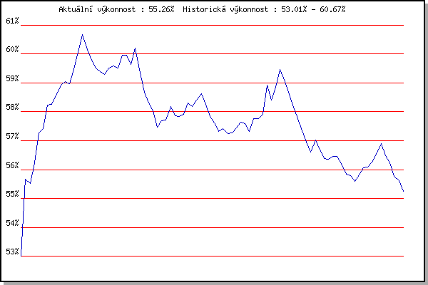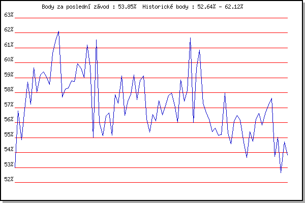 ZávodBodyVýkonnostZměna| 27.06.2012 | Obřany, 8.8 km | 53.01% | 53.01% | | | 11.07.2012 | Popůvky, 7.9 km | 56.78% | 55.66% | +2.65% | | 18.07.2012 | Atletický stadión Pod Palackého vrche | 54.84% | 55.51% | -0.15% | | 01.08.2012 | Palackého vrch, 7.1 km | 56.89% | 56.24% | +0.73% | | 08.08.2012 | Obřany, 8.8 km | 58.73% | 57.28% | +1.04% | | 15.08.2012 | Atletický stadión Pod Palackého vrche | 57.24% | 57.43% | +0.15% | | 22.08.2012 | Líšeň Mariánské údolí, 11 km | 59.66% | 58.23% | +0.80% | | 29.08.2012 | Pisárky Anthropos, 6 km | 58.04% | 58.26% | +0.03% | | 05.09.2012 | Popůvky, 7.9 km | 59.20% | 58.61% | +0.35% | | 12.09.2012 | Líšeň Mariánské údolí, 11 km | 59.40% | 58.92% | +0.31% | | 19.09.2012 | Atletický stadión Pod Palackého vrche | 59.07% | 59.05% | +0.13% | | 28.09.2012 | Blažovice – Svatováclavský běh, 11 km | 58.55% | 58.97% | -0.08% | | 22.05.2013 | Palackého vrch, 7.1 km | 60.63% | 59.46% | +0.49% | | 05.06.2013 | Líšeň, 11 km | 61.49% | 60.05% | +0.59% | | 12.06.2013 | Popůvky, 7.3 km | 62.12% | 60.67% | +0.62% | | 19.06.2013 | Pisárky Anthropos, 6 km | 57.70% | 60.15% | -0.52% | | 26.06.2013 | Palackého vrch – Běh Olympijského dne | 58.25% | 59.79% | -0.36% | | 10.07.2013 | Popůvky, 7.3 km | 58.31% | 59.51% | -0.28% | | 17.07.2013 | Atletický stadión Pod Palackého vrche | 58.78% | 59.39% | -0.12% | | 24.07.2013 | Pisárky Anthropos, 6 km | 58.76% | 59.29% | -0.10% | | 31.07.2013 | Palackého vrch, 7.1 km | 59.96% | 59.51% | +0.22% | | 07.08.2013 | Obřany, 8.8 km | 59.63% | 59.60% | +0.09% | | 14.08.2013 | Atletický stadión Pod Palackého vrche | 59.02% | 59.51% | -0.09% | | 21.08.2013 | Líšeň, 11 km | 61.19% | 59.97% | +0.46% | | 28.08.2013 | Popůvky, 7.3 km | 59.73% | 59.97% | 0.00% | | 04.09.2013 | Atletický stadión Pod Palackého vrche | 55.02% | 59.64% | -0.33% | | 11.09.2013 | Líšeň, 11 km | 61.54% | 60.22% | +0.58% | | 14.05.2014 | Pisárky Anthropos, 6 km | 56.01% | 59.46% | -0.76% | | 21.05.2014 | Palackého vrch, 7.1 km | 55.11% | 58.68% | -0.78% | | 28.05.2014 | Obřany, 8.8 km | 56.44% | 58.30% | -0.38% | | 04.06.2014 | Líšeň, 11 km | 56.65% | 58.04% | -0.26% | | 11.06.2014 | Popůvky, 7.9 km | 55.17% | 57.48% | -0.56% | | 18.06.2014 | Pisárky Anthropos, 6 km | 57.89% | 57.70% | +0.22% | | 25.06.2014 | Palackého vrch – Běh Olympijského dne | 57.31% | 57.72% | +0.02% | | 09.07.2014 | Popůvky, 7.9 km | 59.14% | 58.19% | +0.47% | | 23.07.2014 | Pisárky Anthropos, 6 km | 56.49% | 57.86% | -0.33% | | 30.07.2014 | Palackého vrch, 7.1 km | 57.43% | 57.83% | -0.03% | | 06.08.2014 | Obřany, 8.8 km | 57.90% | 57.91% | +0.08% | | 13.08.2014 | Atletický stadión Pod Palackého vrche | 59.18% | 58.30% | +0.39% | | 20.08.2014 | Líšeň, 11 km | 57.52% | 58.19% | -0.11% | | 27.08.2014 | Popůvky, 5.3 km | 58.84% | 58.40% | +0.21% | | 10.09.2014 | Líšeň, 11 km | 59.12% | 58.63% | +0.23% | | 17.09.2014 | Pisárky Anthropos, 6 km | 56.26% | 58.26% | -0.37% | | 28.09.2014 | Blažovice – Svatováclavský běh, 11 km | 55.37% | 57.84% | -0.42% | | 13.05.2015 | Pisárky Anthropos, 6 km | 56.55% | 57.62% | -0.22% | | 20.05.2015 | Palackého vrch, 7.1 km | 56.10% | 57.32% | -0.30% | | 27.05.2015 | Obřany, 8.8 km | 57.47% | 57.42% | +0.10% | | 03.06.2015 | Líšeň, 11 km | 56.50% | 57.25% | -0.17% | | 10.06.2015 | Popůvky, 7.9 km | 57.12% | 57.27% | +0.02% | | 17.06.2015 | Pisárky Anthropos, 6 km | 57.79% | 57.45% | +0.18% | | 24.06.2015 | Palackého vrch, 7.1 km | 57.97% | 57.63% | +0.18% | | 08.07.2015 | Popůvky, 7.9 km | 57.20% | 57.58% | -0.05% | | 22.07.2015 | Pisárky Anthropos, 6 km | 56.03% | 57.31% | -0.27% | | 29.07.2015 | Palackého vrch, 7.1 km | 58.86% | 57.77% | +0.46% | | 05.08.2015 | Obřany, 8.8 km | 57.42% | 57.76% | -0.01% | | 12.08.2015 | Atletický stadión Pod Palackého vrche | 58.16% | 57.91% | +0.15% | | 19.08.2015 | Líšeň, 10.6 km | 61.68% | 58.92% | +1.01% | | 26.08.2015 | Popůvky, 7.9 km | 56.00% | 58.41% | -0.51% | | 02.09.2015 | Atletický stadión Pod Palackého vrche | 59.62% | 58.84% | +0.43% | | 09.09.2015 | Líšeň, 11 km | 60.86% | 59.47% | +0.63% | | 16.09.2015 | Pisárky Anthropos, 6 km | 57.28% | 59.06% | -0.41% | | 20.04.2016 | Atletický stadión Pod Palackého vrche | 56.70% | 58.61% | -0.45% | | 27.04.2016 | Pisárky Anthropos, 6 km | 56.20% | 58.17% | -0.44% | | 11.05.2016 | Popůvky, 7.9 km | 55.38% | 57.76% | -0.41% | | 25.05.2016 | Obřany, 8.8 km | 55.63% | 57.34% | -0.42% | | 01.06.2016 | Líšeň, 11 km | 55.15% | 56.96% | -0.38% | | 08.06.2016 | Popůvky, 7.9 km | 55.18% | 56.61% | -0.35% | | 29.06.2016 | Obřany, 8.8 km | 57.96% | 57.02% | +0.41% | | 17.08.2016 | Líšeň, 11 km | 55.29% | 56.68% | -0.34% | | 07.09.2016 | Pisárky Anthropos, 6 km | 54.58% | 56.38% | -0.30% | | 26.04.2017 | Pisárky Anthropos, 6 km | 56.09% | 56.37% | -0.01% | | 10.05.2017 | Popůvky, 7.9 km | 56.48% | 56.46% | +0.09% | | 07.06.2017 | Pisárky Anthropos, 6 km | 56.19% | 56.45% | -0.01% | | 14.06.2017 | Popůvky, 7.9 km | 54.67% | 56.15% | -0.30% | | 21.06.2017 | Palackého vrch, 7.1 km | 53.67% | 55.85% | -0.30% | | 28.06.2017 | Obřany, 8.8 km | 55.40% | 55.80% | -0.05% | | 19.07.2017 | Pisárky Anthropos, 6 km | 54.75% | 55.60% | -0.20% | | 26.07.2017 | Palackého vrch, 7.1 km | 56.25% | 55.81% | +0.21% | | 16.08.2017 | Obřany, 8.8 km | 56.63% | 56.07% | +0.26% | | 13.09.2017 | Pisárky Anthropos, 6 km | 55.84% | 56.08% | +0.01% | | 23.05.2018 | Obřany, 8.8 km | 56.69% | 56.29% | +0.21% | | 06.06.2018 | Pisárky Anthropos, 6 km | 57.21% | 56.57% | +0.28% | | 20.06.2018 | Palackého vrch, 7.1 km | 57.62% | 56.89% | +0.32% | | 15.08.2018 | Popůvky, 7.9 km | 53.73% | 56.48% | -0.41% | | 22.08.2018 | Palackého vrch, 7.1 km | 55.03% | 56.23% | -0.25% | | 05.09.2018 | Obřany, 8.8 km | 52.64% | 55.76% | -0.47% | | 12.09.2018 | Pisárky Anthropos, 6 km | 54.73% | 55.61% | -0.15% | | 14.08.2019 | Palackého vrch, 7.1 km | 53.85% | 55.26% | -0.35% | | | | |