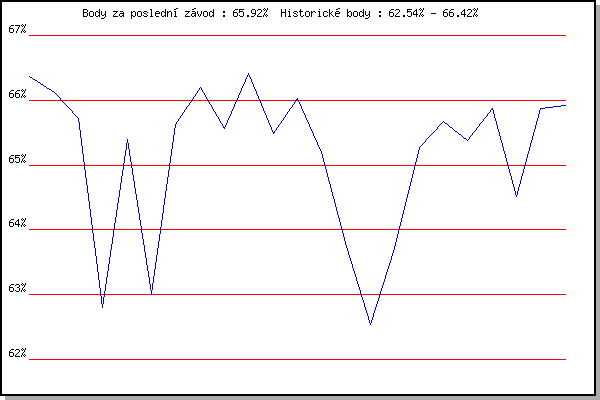 ZávodBodyVýkonnostZměna| 14.05.2008 | Pisárky Anthropos, 6.3 km | 66.37% | 66.37% | | | 28.05.2008 | Líšeň Mariánské údolí, 11.1 km | 66.12% | 66.26% | -0.11% | | 11.06.2008 | Pisárky Anthropos, 6.3 km | 65.72% | 66.10% | -0.16% | | 18.06.2008 | Obřany, 8.8 km | 62.80% | 65.48% | -0.62% | | 21.06.2008 | Běh kolem Mohyly míru, 12.3 km | 65.39% | 65.64% | +0.16% | | 25.06.2008 | Běh Olympijského dne, 7.1 km | 63.02% | 64.95% | -0.69% | | 02.07.2008 | Líšeň Mariánské údolí, 11.1 km | 65.62% | 65.28% | +0.33% | | 09.07.2008 | Veselka, Popůvky Vintrovna, 7.9 km | 66.19% | 65.69% | +0.41% | | 16.07.2008 | Pisárky Anthropos, 6.3 km | 65.56% | 65.79% | +0.10% | | 30.07.2008 | Obřany, 8.8 km | 66.42% | 65.98% | +0.19% | | 06.08.2008 | Líšeň Mariánské údolí, 11.1 km | 65.48% | 65.88% | -0.10% | | 13.08.2008 | Veselka, Popůvky Vintrovna, 7.9 km | 66.02% | 65.94% | +0.06% | | 20.08.2008 | Moravská Slavia dráha, 10 km | 65.19% | 65.81% | -0.13% | | 05.08.2009 | Líšeň Mariánské údolí, 11.1 km | 63.75% | 65.56% | -0.25% | | 12.08.2009 | Veselka, Popůvky Vintrovna, 7.9 km | 62.54% | 65.13% | -0.43% | | 14.07.2010 | Veselka, Popůvky Vintrovna, 7.9 km | 63.71% | 64.88% | -0.25% | | 08.09.2010 | Pisárky Anthropos, 6.3 km | 65.27% | 65.05% | +0.17% | | 18.05.2011 | Palackého vrch, 7.1 km | 65.67% | 65.27% | +0.22% | | 25.05.2011 | Obřany, 8.8 km | 65.38% | 65.38% | +0.11% | | 08.06.2011 | Veselka, Popůvky Vintrovna, 7.9 km | 65.88% | 65.58% | +0.20% | | 15.06.2011 | Pisárky Anthropos, 6 km | 64.52% | 65.38% | -0.20% | | 03.08.2011 | Palackého vrch, 7.1 km | 65.88% | 65.55% | +0.17% | | 31.08.2011 | Popůvky, 7.9 km | 65.92% | 65.70% | +0.15% | | | | |
