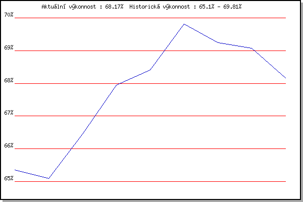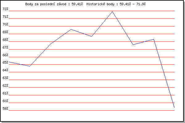 Závod| Body | Výkonnost | Změna | 25.07.2012 | Pisárky Anthropos, 6 km | 65.35% | 65.35% | | 01.08.2012 | Palackého vrch, 7.1 km | 64.78% | 65.10% | -0.25% | 22.08.2012 | Líšeň Mariánské údolí, 11 km | 67.66% | 66.45% | +1.35% | 29.08.2012 | Pisárky Anthropos, 6 km | 69.60% | 67.94% | +1.49% | 05.09.2012 | Popůvky, 7.9 km | 68.68% | 68.41% | +0.47% | 12.09.2012 | Líšeň Mariánské údolí, 11 km | 71.90% | 69.81% | +1.40% | 28.05.2014 | Obřany, 8.8 km | 67.58% | 69.25% | -0.56% | 04.06.2014 | Líšeň, 11 km | 68.30% | 69.07% | -0.18% | 20.04.2016 | Atletický stadión Pod Palackého vrche | 59.41% | 68.17% | -0.90% | | |