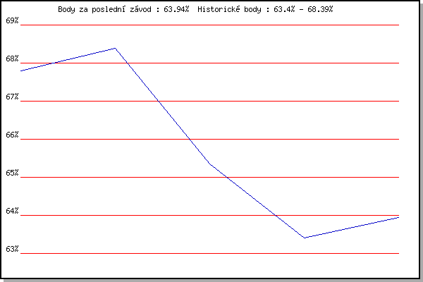 Závod| Body | Výkonnost | Změna | 08.05.2008 | Běh o pohár pivovaru Černá hora, 9.2 | 67.80% | 67.80% | | 21.06.2008 | Běh kolem Mohyly míru, 12.3 km | 68.39% | 68.21% | +0.41% | 28.09.2008 | Blažovice Svatováclavský běh, 11 km | 65.35% | 67.41% | -0.80% | 28.09.2014 | Blažovice – Svatováclavský běh, 11 km | 63.40% | 66.39% | -1.02% | 28.09.2015 | Blažovice – Svatováclavský běh, 11 km | 63.94% | 65.71% | -0.68% | | |
