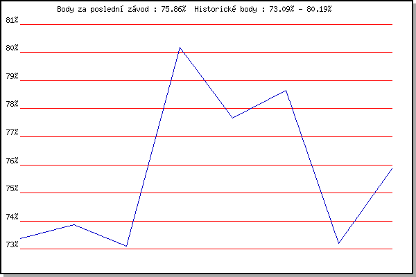 Závod| Body | Výkonnost | Změna | 01.08.2012 | Palackého vrch, 7.1 km | 73.38% | 73.38% | | 21.08.2013 | Líšeň, 11 km | 73.87% | 73.72% | +0.34% | 02.07.2014 | Obřany, 8.8 km | 73.09% | 73.51% | -0.21% | 23.07.2014 | Pisárky Anthropos, 6 km | 80.19% | 76.44% | +2.93% | 20.08.2014 | Líšeň, 11 km | 77.67% | 77.14% | +0.70% | 01.06.2016 | Líšeň, 11 km | 78.66% | 77.90% | +0.76% | 17.08.2016 | Líšeň, 11 km | 73.20% | 76.75% | -1.15% | 31.08.2016 | Atletický stadión Pod Palackého vrche | 75.86% | 76.69% | -0.06% | | |