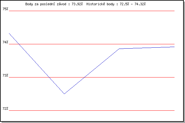 Závod| Body | Výkonnost | Změna | 08.08.2012 | Obřany, 8.8 km | 74.32% | 74.32% | | 22.08.2012 | Líšeň Mariánské údolí, 11 km | 72.50% | 73.52% | -0.80% | 29.08.2012 | Pisárky Anthropos, 6 km | 73.86% | 73.79% | +0.27% | 05.09.2012 | Popůvky, 7.9 km | 73.92% | 73.95% | +0.16% | | |