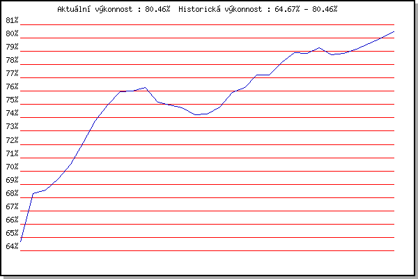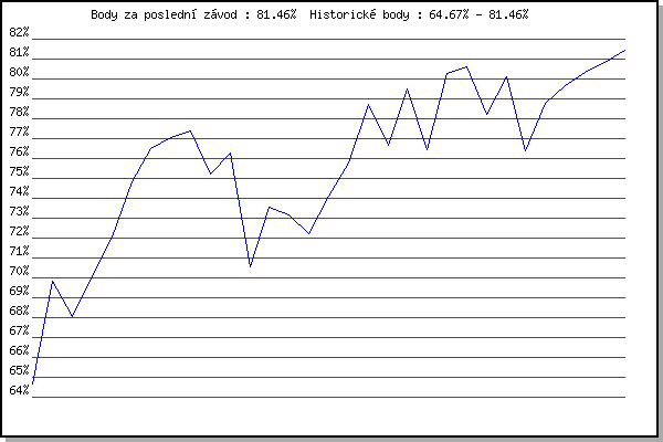 ZávodBodyVýkonnostZměna| 15.08.2012 | Atletický stadión Pod Palackého vrche | 64.67% | 64.67% | | | 29.08.2012 | Pisárky Anthropos, 6 km | 69.85% | 68.31% | +3.64% | | 12.09.2012 | Líšeň Mariánské údolí, 11 km | 68.08% | 68.56% | +0.25% | | 19.09.2012 | Atletický stadión Pod Palackého vrche | 70.06% | 69.40% | +0.84% | | 28.09.2012 | Blažovice – Svatováclavský běh, 11 km | 72.04% | 70.49% | +1.09% | | 15.05.2013 | Pisárky Anthropos, 6 km | 74.84% | 72.15% | +1.66% | | 22.05.2013 | Palackého vrch, 7.1 km | 76.49% | 73.74% | +1.59% | | 29.05.2013 | Obřany, 8.8 km | 77.04% | 74.97% | +1.23% | | 05.06.2013 | Líšeň, 11 km | 77.38% | 75.94% | +0.97% | | 12.06.2013 | Popůvky, 7.3 km | 75.23% | 76.00% | +0.06% | | 19.06.2013 | Pisárky Anthropos, 6 km | 76.28% | 76.26% | +0.26% | | 26.06.2013 | Palackého vrch – Běh Olympijského dne | 70.57% | 75.18% | -1.08% | | 03.07.2013 | Obřany, 8.8 km | 73.53% | 74.99% | -0.19% | | 10.07.2013 | Popůvky, 7.3 km | 73.16% | 74.74% | -0.25% | | 17.07.2013 | Atletický stadión Pod Palackého vrche | 72.25% | 74.24% | -0.50% | | 24.07.2013 | Pisárky Anthropos, 6 km | 74.09% | 74.30% | +0.06% | | 31.07.2013 | Palackého vrch, 7.1 km | 75.79% | 74.79% | +0.49% | | 07.08.2013 | Obřany, 8.8 km | 78.71% | 75.92% | +1.13% | | 14.08.2013 | Atletický stadión Pod Palackého vrche | 76.65% | 76.25% | +0.33% | | 21.08.2013 | Líšeň, 11 km | 79.51% | 77.23% | +0.98% | | 28.08.2013 | Popůvky, 7.3 km | 76.47% | 77.20% | -0.03% | | 04.09.2013 | Atletický stadión Pod Palackého vrche | 80.30% | 78.14% | +0.94% | | 11.09.2013 | Líšeň, 11 km | 80.60% | 78.89% | +0.75% | | 18.09.2013 | Pisárky Anthropos, 6 km | 78.23% | 78.86% | -0.03% | | 28.09.2013 | Blažovice – Svatováclavský běh, 11 km | 80.10% | 79.29% | +0.43% | | 14.05.2014 | Pisárky Anthropos, 6 km | 76.40% | 78.72% | -0.57% | | 21.05.2014 | Palackého vrch, 7.1 km | 78.77% | 78.85% | +0.13% | | 25.06.2014 | Palackého vrch – Běh Olympijského dne | 79.68% | 79.18% | +0.33% | | 20.08.2014 | Líšeň, 11 km | 80.31% | 79.60% | +0.42% | | 03.09.2014 | Atletický stadión Pod Palackého vrche | 80.85% | 80.02% | +0.42% | | 09.09.2015 | Líšeň, 11 km | 81.46% | 80.46% | +0.44% | | | | |