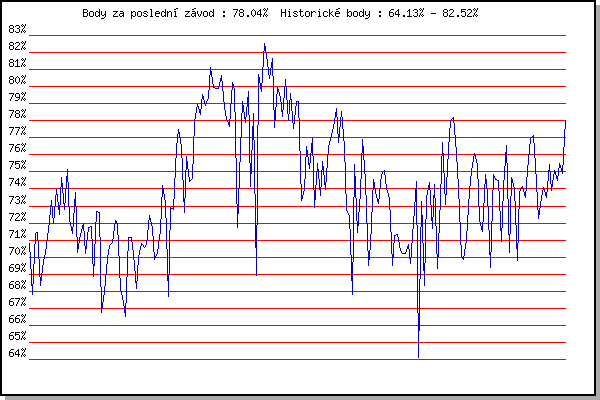 ZávodBodyVýkonnostZměna| 17.05.2006 | Pisárky Anthropos, 6.6 km | 70.80% | 70.80% | | | 24.05.2006 | Obřany, 8.8 km | 67.80% | 69.48% | -1.32% | | 31.05.2006 | Palackého vrch vodárna, 9 km | 71.38% | 70.63% | +1.15% | | 07.06.2006 | Líšeň Mariánské údolí, 11.1 km | 71.44% | 71.20% | +0.57% | | 19.07.2006 | Líšeň Mariánské údolí, 11.1 km | 68.37% | 70.38% | -0.82% | | 02.08.2006 | Pisárky Anthropos, 6.6 km | 69.72% | 70.29% | -0.09% | | 23.08.2006 | Líšeň Mariánské údolí, 11.1 km | 70.26% | 70.41% | +0.12% | | 30.08.2006 | Veselka Popůvky Vintrovna, 7.9 km | 71.63% | 70.87% | +0.46% | | 16.05.2007 | Pisárky Anthropos, 6.6 km | 73.35% | 71.66% | +0.79% | | 23.05.2007 | Obřany, 8.8 km | 71.99% | 71.86% | +0.20% | | 30.05.2007 | Líšeň Mariánské údolí, 11.1 km | 73.94% | 72.52% | +0.66% | | 13.06.2007 | Pisárky Anthropos, 6.6 km | 72.49% | 72.63% | +0.11% | | 27.06.2007 | Obřany, 8.8 km | 74.67% | 73.25% | +0.62% | | 04.07.2007 | Líšeň Mariánské údolí, 11.1 km | 72.79% | 73.21% | -0.04% | | 11.07.2007 | Veselka, Popůvky Vintrovna, 7.9 km | 75.14% | 73.79% | +0.58% | | 25.07.2007 | Pisárky Anthropos, 6.6 km | 72.22% | 73.48% | -0.31% | | 01.08.2007 | Obřany, 8.8 km | 71.39% | 73.10% | -0.38% | | 22.08.2007 | Veselka, Popůvky Vintrovna, 7.9 km | 73.82% | 73.37% | +0.27% | | 21.05.2008 | Obřany, 8.8 km | 70.26% | 72.91% | -0.46% | | 28.05.2008 | Líšeň Mariánské údolí, 11.1 km | 71.32% | 72.64% | -0.27% | | 04.06.2008 | Veselka, Popůvky Vintrovna, 9.6 km | 71.97% | 72.54% | -0.10% | | 11.06.2008 | Pisárky Anthropos, 6.3 km | 70.20% | 72.13% | -0.41% | | 18.06.2008 | Obřany, 8.8 km | 71.75% | 72.12% | -0.01% | | 09.07.2008 | Veselka, Popůvky Vintrovna, 7.9 km | 71.78% | 72.13% | +0.01% | | 30.07.2008 | Obřany, 8.8 km | 68.88% | 71.74% | -0.39% | | 06.08.2008 | Líšeň Mariánské údolí, 11.1 km | 72.67% | 72.06% | +0.32% | | 13.08.2008 | Veselka, Popůvky Vintrovna, 7.9 km | 72.63% | 72.30% | +0.24% | | 13.05.2009 | Pisárky Anthropos, 6.3 km | 66.77% | 71.71% | -0.59% | | 20.05.2009 | Obřany, 8.8 km | 68.00% | 70.99% | -0.72% | | 27.05.2009 | Líšeň Mariánské údolí, 11.1 km | 69.94% | 70.87% | -0.12% | | 03.06.2009 | Veselka, Popůvky Vintrovna, 7.9 km | 70.66% | 70.96% | +0.09% | | 17.06.2009 | Obřany, 8.8 km | 70.88% | 71.07% | +0.11% | | 24.06.2009 | Palackého vrch Běh Olympijského dne | 72.18% | 71.43% | +0.36% | | 08.07.2009 | Veselka, Popůvky Vintrovna, 7.9 km | 71.89% | 71.62% | +0.19% | | 29.07.2009 | Obřany, 8.8 km | 68.17% | 71.06% | -0.56% | | 05.08.2009 | Líšeň Mariánské údolí, 11.1 km | 67.33% | 70.44% | -0.62% | | 28.09.2009 | Blažovice Svatováclavský běh, 11 km | 66.51% | 69.81% | -0.63% | | 12.05.2010 | Pisárky Anthropos, 6.3 km | 71.14% | 70.29% | +0.48% | | 19.05.2010 | Palackého vrch , 7.1 km | 71.18% | 70.65% | +0.36% | | 26.05.2010 | Obřany, 8.8 km | 70.13% | 70.68% | +0.03% | | 02.06.2010 | Líšeň Mariánské údolí, 11.1 km | 68.19% | 70.19% | -0.49% | | 09.06.2010 | Veselka, Popůvky Vintrovna, 7.9 km | 69.98% | 70.24% | +0.05% | | 16.06.2010 | Pisárky Anthropos, 6.3 km | 70.78% | 70.48% | +0.24% | | 23.06.2010 | Palackého vrch Běh Olympijského dne | 70.58% | 70.62% | +0.14% | | 30.06.2010 | Obřany, 8.8 km | 70.77% | 70.72% | +0.10% | | 14.07.2010 | Veselka, Popůvky Vintrovna, 7.9 km | 72.45% | 71.20% | +0.48% | | 28.07.2010 | Pisárky Anthropos, 6.3 km | 71.66% | 71.37% | +0.17% | | 04.08.2010 | Palackého vrch , 7.1 km | 69.84% | 71.08% | -0.29% | | 11.08.2010 | Obřany, 8.8 km | 70.25% | 70.94% | -0.14% | | 25.08.2010 | Líšeň Mariánské údolí, 11.1 km | 71.56% | 71.15% | +0.21% | | 01.09.2010 | Veselka, Popůvky Vintrovna, 7.9 km | 74.19% | 71.97% | +0.82% | | 08.09.2010 | Pisárky Anthropos, 6.3 km | 73.20% | 72.37% | +0.40% | | 22.09.2010 | Moravská Slavia dráha, 15 km | 67.72% | 71.83% | -0.54% | | 28.09.2010 | Blažovice Svatováclavský běh, 9.4 km | 72.92% | 72.25% | +0.42% | | 09.10.2010 | Mizuno sedmička, 7 km | 72.79% | 72.51% | +0.26% | | 11.05.2011 | Pisárky Anthropos, 6 km | 76.41% | 73.61% | +1.10% | | 18.05.2011 | Palackého vrch, 7.1 km | 77.46% | 74.73% | +1.12% | | 25.05.2011 | Obřany, 8.8 km | 76.44% | 75.32% | +0.59% | | 09.05.2012 | Pisárky Anthropos, 6 km | 72.61% | 74.81% | -0.51% | | 16.05.2012 | Palackého vrch, 7.1 km | 75.91% | 75.19% | +0.38% | | 23.05.2012 | Obřany, 8.8 km | 74.43% | 75.13% | -0.06% | | 30.05.2012 | Líšeň Mariánské údolí, 11 km | 74.60% | 75.12% | -0.01% | | 06.06.2012 | Popůvky, 7.9 km | 77.89% | 75.93% | +0.81% | | 13.06.2012 | Pisárky Anthropos, 6 km | 78.97% | 76.83% | +0.90% | | 27.06.2012 | Obřany, 8.8 km | 78.35% | 77.33% | +0.50% | | 11.07.2012 | Popůvky, 7.9 km | 79.53% | 78.03% | +0.70% | | 18.07.2012 | Atletický stadión Pod Palackého vrche | 78.89% | 78.41% | +0.38% | | 25.07.2012 | Pisárky Anthropos, 6 km | 79.35% | 78.79% | +0.38% | | 01.08.2012 | Palackého vrch, 7.1 km | 81.14% | 79.50% | +0.71% | | 08.08.2012 | Obřany, 8.8 km | 79.93% | 79.69% | +0.19% | | 22.08.2012 | Líšeň Mariánské údolí, 11 km | 79.90% | 79.81% | +0.12% | | 29.08.2012 | Pisárky Anthropos, 6 km | 79.87% | 79.89% | +0.08% | | 05.09.2012 | Popůvky, 7.9 km | 80.66% | 80.12% | +0.23% | | 15.05.2013 | Pisárky Anthropos, 6 km | 78.80% | 79.87% | -0.25% | | 22.05.2013 | Palackého vrch, 7.1 km | 78.13% | 79.59% | -0.28% | | 29.05.2013 | Obřany, 8.8 km | 77.64% | 79.27% | -0.32% | | 05.06.2013 | Líšeň, 11 km | 80.26% | 79.59% | +0.32% | | 12.06.2013 | Popůvky, 7.3 km | 79.81% | 79.72% | +0.13% | | 19.06.2013 | Pisárky Anthropos, 6 km | 71.76% | 79.25% | -0.47% | | 26.06.2013 | Palackého vrch – Běh Olympijského dne | 76.29% | 78.70% | -0.55% | | 03.07.2013 | Obřany, 8.8 km | 79.12% | 78.92% | +0.22% | | 10.07.2013 | Popůvky, 7.3 km | 77.92% | 78.81% | -0.11% | | 17.07.2013 | Atletický stadión Pod Palackého vrche | 79.71% | 79.15% | +0.34% | | 31.07.2013 | Palackého vrch, 7.1 km | 74.14% | 78