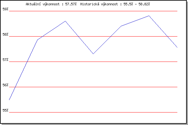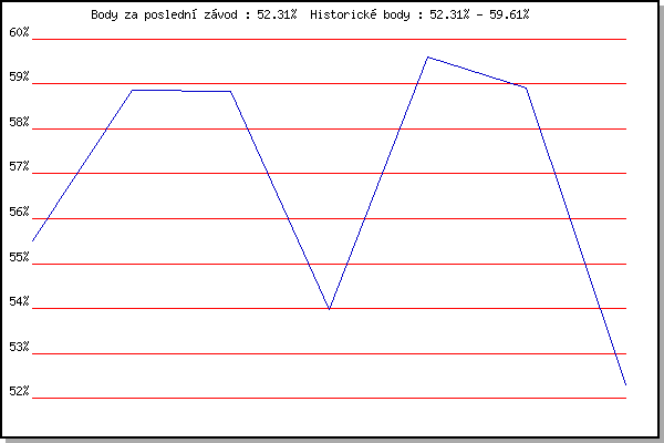Závod| Body | Výkonnost | Změna | 29.08.2012 | Pisárky Anthropos, 6 km | 55.50% | 55.50% | | 05.09.2012 | Popůvky, 7.9 km | 58.87% | 57.86% | +2.36% | 19.09.2012 | Atletický stadión Pod Palackého vrche | 58.83% | 58.60% | +0.74% | 29.05.2013 | Obřany, 8.8 km | 53.97% | 57.31% | -1.29% | 31.07.2013 | Palackého vrch, 7.1 km | 59.61% | 58.41% | +1.10% | 09.07.2014 | Popůvky, 7.9 km | 58.90% | 58.82% | +0.41% | 16.07.2014 | Atletický stadión Pod Palackého vrche | 52.31% | 57.57% | -1.25% | | |