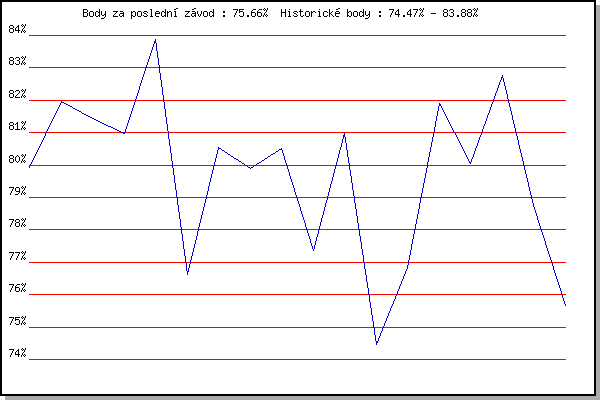 ZávodBodyVýkonnostZměna| 12.09.2012 | Líšeň Mariánské údolí, 11 km | 79.93% | 79.93% | | | 28.09.2012 | Blažovice – Svatováclavský běh, 11 km | 81.95% | 81.33% | +1.40% | | 22.05.2013 | Palackého vrch, 7.1 km | 81.44% | 81.53% | +0.20% | | 29.05.2013 | Obřany, 8.8 km | 80.96% | 81.39% | -0.14% | | 05.06.2013 | Líšeň, 11 km | 83.88% | 82.36% | +0.97% | | 12.06.2013 | Popůvky, 7.3 km | 76.63% | 81.50% | -0.86% | | 19.06.2013 | Pisárky Anthropos, 6 km | 80.53% | 81.49% | -0.01% | | 26.06.2013 | Palackého vrch – Běh Olympijského dne | 79.89% | 81.12% | -0.37% | | 10.07.2013 | Popůvky, 7.3 km | 80.52% | 81.01% | -0.11% | | 17.07.2013 | Atletický stadión Pod Palackého vrche | 77.38% | 80.41% | -0.60% | | 24.07.2013 | Pisárky Anthropos, 6 km | 80.96% | 80.72% | +0.31% | | 07.08.2013 | Obřany, 8.8 km | 74.47% | 79.91% | -0.81% | | 14.08.2013 | Atletický stadión Pod Palackého vrche | 76.83% | 79.32% | -0.59% | | 21.08.2013 | Líšeň, 11 km | 81.90% | 80.12% | +0.80% | | 28.08.2013 | Popůvky, 7.3 km | 80.05% | 80.27% | +0.15% | | 04.09.2013 | Atletický stadión Pod Palackého vrche | 82.77% | 81.09% | +0.82% | | 18.09.2013 | Pisárky Anthropos, 6 km | 78.76% | 80.70% | -0.39% | | 28.09.2013 | Blažovice – Svatováclavský běh, 11 km | 75.66% | 79.86% | -0.84% | | | | |