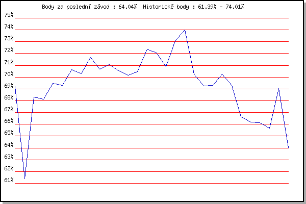ZávodBodyVýkonnostZměna| 31.05.2006 | Palackého vrch vodárna, 9 km | 69.23% | 69.23% | | | 04.07.2007 | Líšeň Mariánské údolí, 11.1 km | 61.39% | 65.86% | -3.37% | | 25.07.2007 | Pisárky Anthropos, 6.6 km | 68.31% | 67.56% | +1.70% | | 22.08.2007 | Veselka, Popůvky Vintrovna, 7.9 km | 68.12% | 68.29% | +0.73% | | 21.05.2008 | Obřany, 8.8 km | 69.46% | 68.84% | +0.55% | | 11.06.2008 | Pisárky Anthropos, 6.3 km | 69.30% | 69.04% | +0.20% | | 09.07.2008 | Veselka, Popůvky Vintrovna, 7.9 km | 70.63% | 69.61% | +0.57% | | 16.07.2008 | Pisárky Anthropos, 6.3 km | 70.28% | 69.89% | +0.28% | | 13.05.2009 | Pisárky Anthropos, 6.3 km | 71.67% | 70.48% | +0.59% | | 20.05.2009 | Obřany, 8.8 km | 70.66% | 70.60% | +0.12% | | 19.05.2010 | Palackého vrch , 7.1 km | 71.08% | 70.80% | +0.20% | | 26.05.2010 | Obřany, 8.8 km | 70.54% | 70.80% | 0.00% | | 09.06.2010 | Veselka, Popůvky Vintrovna, 7.9 km | 70.17% | 70.68% | -0.12% | | 16.06.2010 | Pisárky Anthropos, 6.3 km | 70.48% | 70.65% | -0.03% | | 30.06.2010 | Obřany, 8.8 km | 72.38% | 71.13% | +0.48% | | 07.07.2010 | Líšeň Mariánské údolí, 11.1 km | 72.04% | 71.41% | +0.28% | | 21.07.2010 | Moravská Slavia dráha, 5 km | 70.90% | 71.33% | -0.08% | | 28.07.2010 | Pisárky Anthropos, 6.3 km | 73.04% | 71.81% | +0.48% | | 25.08.2010 | Líšeň Mariánské údolí, 11.1 km | 74.01% | 72.44% | +0.63% | | 11.05.2011 | Pisárky Anthropos, 6 km | 70.26% | 72.03% | -0.41% | | 20.07.2011 | AC Moravská Slávia, 5km atletický o | 69.27% | 71.64% | -0.39% | | 27.07.2011 | Pisárky Anthropos, 6 km | 69.28% | 71.17% | -0.47% | | 10.08.2011 | Obřany, 8.8 km | 70.26% | 71.04% | -0.13% | | 07.09.2011 | Pisárky Anthropos, 6 km | 69.29% | 70.69% | -0.35% | | 16.05.2012 | Palackého vrch, 7.1 km | 66.65% | 70.40% | -0.29% | | 13.06.2012 | Pisárky Anthropos, 6 km | 66.19% | 69.66% | -0.74% | | 29.05.2013 | Obřany, 8.8 km | 66.16% | 68.98% | -0.68% | | 24.07.2013 | Pisárky Anthropos, 6 km | 65.66% | 68.42% | -0.56% | | 21.08.2013 | Líšeň, 11 km | 69.02% | 68.68% | +0.26% | | 06.09.2017 | Líšeň, 11 km | 64.04% | 68.10% | -0.58% | | | | |