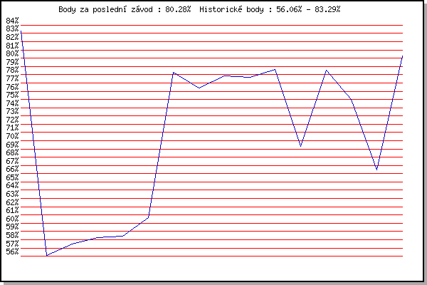 ZávodBodyVýkonnostZměna| 28.09.2012 | Blažovice – Svatováclavský běh, 11 km | 83.29% | 83.28% | | | 13.05.2015 | Pisárky Anthropos, 6 km | 56.06% | 72.46% | -10.82% | | 20.05.2015 | Palackého vrch, 7.1 km | 57.45% | 66.84% | -5.62% | | 03.06.2015 | Líšeň, 11 km | 58.23% | 64.22% | -2.62% | | 10.06.2015 | Popůvky, 7.9 km | 58.41% | 62.63% | -1.59% | | 24.06.2015 | Palackého vrch, 7.1 km | 60.64% | 62.30% | -0.33% | | 01.07.2015 | Obřany, 8.8 km | 78.31% | 68.04% | +5.74% | | 08.07.2015 | Popůvky, 7.9 km | 76.41% | 71.18% | +3.14% | | 15.07.2015 | Atletický stadión Pod Palackého vrche | 77.84% | 73.82% | +2.64% | | 22.07.2015 | Pisárky Anthropos, 6 km | 77.67% | 75.68% | +1.86% | | 29.07.2015 | Palackého vrch, 7.1 km | 78.61% | 77.25% | +1.57% | | 05.08.2015 | Obřany, 8.8 km | 69.30% | 75.91% | -1.34% | | 12.08.2015 | Atletický stadión Pod Palackého vrche | 78.57% | 76.95% | +1.04% | | 26.08.2015 | Popůvky, 7.9 km | 75.03% | 76.84% | -0.11% | | 02.09.2015 | Atletický stadión Pod Palackého vrche | 66.46% | 75.01% | -1.83% | | 16.09.2015 | Pisárky Anthropos, 6 km | 80.28% | 76.80% | +1.79% | | | | |