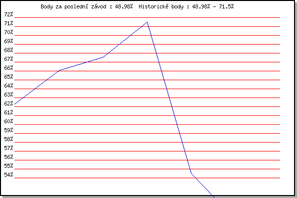 Závod| Body | Výkonnost | Změna | 28.06.2006 | Pisárky Anthropos, 6.6 km | 62.26% | 62.27% | | 12.07.2006 | Obřany, 8.8 km | 66.06% | 64.92% | +2.65% | 25.07.2006 | Veselka Popůvky Vintrovna, 7.9 km | 67.55% | 66.54% | +1.62% | 02.08.2006 | Pisárky Anthropos, 6.6 km | 71.50% | 68.91% | +2.37% | 23.05.2007 | Obřany, 8.8 km | 54.53% | 66.26% | -2.65% | 11.05.2011 | Pisárky Anthropos, 6 km | 49.27% | 62.91% | -3.35% | 15.06.2011 | Pisárky Anthropos, 6 km | 48.98% | 59.74% | -3.17% | | |