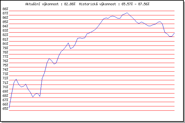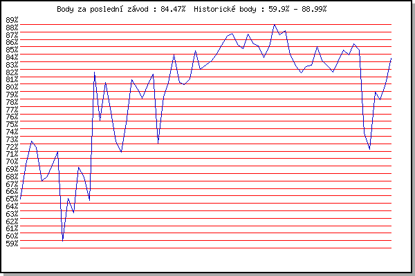 ZávodBodyVýkonnostZměna| 24.05.2006 | Obřany, 8.8 km | 65.57% | 65.57% | | | 14.06.2006 | Veselka, Popůvky Vintrovna, 7.9 km | 70.17% | 68.80% | +3.23% | | 22.06.2006 | Palackého vrch dráha, 5 km | 73.39% | 71.50% | +2.70% | | 28.06.2006 | Pisárky Anthropos, 6.6 km | 72.50% | 72.26% | +0.76% | | 12.07.2006 | Obřany, 8.8 km | 67.98% | 71.06% | -1.20% | | 02.08.2006 | Pisárky Anthropos, 6.6 km | 68.63% | 70.46% | -0.60% | | 30.08.2006 | Veselka Popůvky Vintrovna, 7.9 km | 70.13% | 70.51% | +0.05% | | 16.05.2007 | Pisárky Anthropos, 6.6 km | 71.96% | 71.08% | +0.57% | | 23.05.2007 | Obřany, 8.8 km | 59.90% | 69.99% | -1.09% | | 27.06.2007 | Obřany, 8.8 km | 65.70% | 69.22% | -0.77% | | 11.07.2007 | Veselka, Popůvky Vintrovna, 7.9 km | 63.76% | 68.10% | -1.12% | | 25.07.2007 | Pisárky Anthropos, 6.6 km | 69.88% | 68.80% | +0.70% | | 01.08.2007 | Obřany, 8.8 km | 68.50% | 68.98% | +0.18% | | 15.08.2007 | Moravská Slávia dráha, 10 km | 65.39% | 68.28% | -0.70% | | 13.05.2009 | Pisárky Anthropos, 6.3 km | 82.60% | 72.40% | +4.12% | | 03.06.2009 | Veselka, Popůvky Vintrovna, 7.9 km | 76.13% | 73.72% | +1.32% | | 10.06.2009 | Pisárky Anthropos, 6.3 km | 81.20% | 76.09% | +2.37% | | 08.07.2009 | Veselka, Popůvky Vintrovna, 7.9 km | 77.82% | 77.01% | +0.92% | | 15.07.2009 | Pisárky Anthropos, 6.3 km | 73.29% | 76.49% | -0.52% | | 05.08.2009 | Líšeň Mariánské údolí, 11.1 km | 71.90% | 75.71% | -0.78% | | 12.08.2009 | Veselka, Popůvky Vintrovna, 7.9 km | 75.79% | 75.97% | +0.26% | | 08.05.2010 | Běh o pohár pivovaru Černá hora, 9. | 81.55% | 77.61% | +1.64% | | 02.06.2010 | Líšeň Mariánské údolí, 11.1 km | 80.42% | 78.60% | +0.99% | | 09.06.2010 | Veselka, Popůvky Vintrovna, 7.9 km | 79.12% | 79.03% | +0.43% | | 16.06.2010 | Pisárky Anthropos, 6.3 km | 80.88% | 79.77% | +0.74% | | 23.06.2010 | Palackého vrch Běh Olympijského dne | 82.34% | 80.62% | +0.85% | | 30.06.2010 | Obřany, 8.8 km | 73.10% | 79.27% | -1.35% | | 14.07.2010 | Veselka, Popůvky Vintrovna, 7.9 km | 79.26% | 79.57% | +0.30% | | 21.07.2010 | Moravská Slavia dráha, 5 km | 81.20% | 80.29% | +0.72% | | 28.07.2010 | Pisárky Anthropos, 6.3 km | 84.88% | 81.69% | +1.40% | | 11.08.2010 | Obřany, 8.8 km | 81.24% | 81.74% | +0.05% | | 18.08.2010 | Moravská Slavia dráha, 10 km | 80.92% | 81.66% | -0.08% | | 25.08.2010 | Líšeň Mariánské údolí, 11.1 km | 81.65% | 81.77% | +0.11% | | 01.09.2010 | Veselka, Popůvky Vintrovna, 7.9 km | 85.44% | 82.76% | +0.99% | | 08.09.2010 | Pisárky Anthropos, 6.3 km | 82.95% | 82.90% | +0.14% | | 09.10.2010 | Mizuno sedmička, 7 km | 83.53% | 83.16% | +0.26% | | 11.05.2011 | Pisárky Anthropos, 6 km | 84.11% | 83.50% | +0.34% | | 18.05.2011 | Palackého vrch, 7.1 km | 84.95% | 83.98% | +0.48% | | 25.05.2011 | Obřany, 8.8 km | 86.17% | 84.65% | +0.67% | | 08.06.2011 | Veselka, Popůvky Vintrovna, 7.9 km | 87.43% | 85.47% | +0.82% | | 15.06.2011 | Pisárky Anthropos, 6 km | 87.75% | 86.17% | +0.70% | | 23.06.2011 | Palackého vrch – Běh Olympijského dne | 86.34% | 86.34% | +0.17% | | 29.06.2011 | Obřany, 8.8 km | 85.78% | 86.32% | -0.02% | | 13.07.2011 | Popůvky, 7.9 km | 87.67% | 86.75% | +0.43% | | 20.07.2011 | AC Moravská Slávia, 5km atletický o | 86.44% | 86.76% | +0.01% | | 27.07.2011 | Pisárky Anthropos, 6 km | 86.09% | 86.64% | -0.12% | | 10.08.2011 | Obřany, 8.8 km | 84.54% | 86.29% | -0.35% | | 17.08.2011 | AC Moravská Slávia, 10km atletický | 85.99% | 86.30% | +0.01% | | 31.08.2011 | Popůvky, 7.9 km | 88.99% | 87.06% | +0.76% | | 07.09.2011 | Pisárky Anthropos, 6 km | 87.60% | 87.27% | +0.21% | | 14.09.2011 | Líšeň Mariánské údolí, 11.1 km | 88.16% | 87.56% | +0.29% | | 21.09.2011 | AC Moravská Slávia Brno, 1hod atlet | 84.96% | 87.10% | -0.46% | | 09.05.2012 | Pisárky Anthropos, 6 km | 83.43% | 86.61% | -0.49% | | 23.05.2012 | Obřany, 8.8 km | 82.54% | 85.98% | -0.63% | | 06.06.2012 | Popůvky, 7.9 km | 83.38% | 85.47% | -0.51% | | 13.06.2012 | Pisárky Anthropos, 6 km | 83.54% | 85.09% | -0.38% | | 11.07.2012 | Popůvky, 7.9 km | 86.05% | 85.42% | +0.33% | | 18.07.2012 | Atletický stadión Pod Palackého vrche | 84.18% | 85.21% | -0.21% | | 01.08.2012 | Palackého vrch, 7.1 km | 83.47% | 84.86% | -0.35% | | 08.08.2012 | Obřany, 8.8 km | 82.61% | 84.52% | -0.34% | | 15.08.2012 | Atletický stadión Pod Palackého vrche | 84.01% | 84.49% | -0.03% | | 22.08.2012 | Líšeň Mariánské údolí, 11 km | 85.53% | 84.81% | +0.32% | | 29.08.2012 | Pisárky Anthropos, 6 km | 84.93% | 84.91% | +0.10% | | 05.09.2012 | Popůvky, 7.9 km | 86.38% | 85.35% | +0.44% | | 12.09.2012 | Líšeň Mariánské údolí, 11 km | 85.55% | 85.49% | +0.14% | | 19.09.2012 | Atletický stadión Pod Palackého vrche | 74.47% | 85.02% | -0.47% | | 28.09.2012 | Blažovice – Svatováclavský běh, 11 km | 72.25% | 83.01% | -2.01% | | 26.06.2013 | Palackého vrch – Běh Olympijského dne | 79.93% | 82.66% | -0.35% | | 28.09.2013 | Blažovice – Svatováclavský běh, 11 km | 78.93% | 82.14% | -0.52% | | 18.06.2014 | Pisárky Anthropos, 6 km | 80.99% | 82.13% | -0.01% | | 28.09.2014 | Blažovice – Svatováclavský běh, 11 km | 84.47% | 82.88% | +0.75% | | | | |