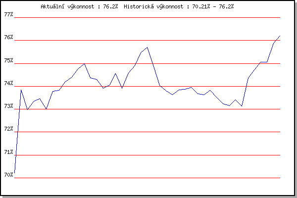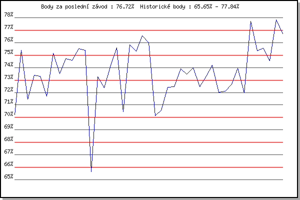 ZávodBodyVýkonnostZměna| 24.05.2006 | Obřany, 8.8 km | 70.21% | 70.21% | | | 31.05.2006 | Palackého vrch vodárna, 9 km | 75.39% | 73.84% | +3.63% | | 07.06.2006 | Líšeň Mariánské údolí, 11.1 km | 71.44% | 72.99% | -0.85% | | 14.06.2006 | Veselka, Popůvky Vintrovna, 7.9 km | 73.38% | 73.34% | +0.35% | | 22.06.2006 | Palackého vrch dráha, 5 km | 73.29% | 73.46% | +0.12% | | 28.06.2006 | Pisárky Anthropos, 6.6 km | 71.71% | 73.01% | -0.45% | | 12.07.2006 | Obřany, 8.8 km | 75.16% | 73.78% | +0.77% | | 19.07.2006 | Líšeň Mariánské údolí, 11.1 km | 73.52% | 73.83% | +0.05% | | 25.07.2006 | Veselka Popůvky Vintrovna, 7.9 km | 74.71% | 74.20% | +0.37% | | 02.08.2006 | Pisárky Anthropos, 6.6 km | 74.57% | 74.38% | +0.18% | | 09.08.2006 | Palackého vrch, 9 km | 75.52% | 74.75% | +0.37% | | 16.08.2006 | Obřany, 8.8 km | 75.41% | 75.00% | +0.25% | | 30.08.2006 | Veselka Popůvky Vintrovna, 7.9 km | 65.65% | 74.36% | -0.64% | | 16.05.2007 | Pisárky Anthropos, 6.6 km | 73.25% | 74.30% | -0.06% | | 30.05.2007 | Líšeň Mariánské údolí, 11.1 km | 72.37% | 73.92% | -0.38% | | 13.06.2007 | Pisárky Anthropos, 6.6 km | 74.18% | 74.07% | +0.15% | | 20.06.2007 | Palackého vrch Běh Olympijského dne | 75.59% | 74.55% | +0.48% | | 27.06.2007 | Obřany, 8.8 km | 70.47% | 73.91% | -0.64% | | 11.07.2007 | Veselka, Popůvky Vintrovna, 7.9 km | 75.82% | 74.57% | +0.66% | | 15.08.2007 | Moravská Slávia dráha, 10 km | 75.30% | 74.91% | +0.34% | | 22.08.2007 | Veselka, Popůvky Vintrovna, 7.9 km | 76.57% | 75.46% | +0.55% | | 20.08.2008 | Moravská Slavia dráha, 10 km | 75.99% | 75.70% | +0.24% | | 11.05.2011 | Pisárky Anthropos, 6 km | 70.13% | 74.86% | -0.84% | | 25.05.2011 | Obřany, 8.8 km | 70.58% | 74.03% | -0.83% | | 15.06.2011 | Pisárky Anthropos, 6 km | 72.41% | 73.80% | -0.23% | | 23.06.2011 | Palackého vrch – Běh Olympijského dne | 72.48% | 73.63% | -0.17% | | 13.07.2011 | Popůvky, 7.9 km | 73.91% | 73.85% | +0.22% | | 27.07.2011 | Pisárky Anthropos, 6 km | 73.45% | 73.86% | +0.01% | | 03.08.2011 | Palackého vrch, 7.1 km | 73.97% | 73.96% | +0.10% | | 17.08.2011 | AC Moravská Slávia, 10km atletický | 72.48% | 73.67% | -0.29% | | 05.06.2019 | Palackého vrch, 7.1 km | 73.30% | 73.63% | -0.04% | | 17.07.2019 | Palackého vrch, 7.1 km | 74.17% | 73.82% | +0.19% | | 07.08.2019 | Hotel Myslivna, 7 km | 72.03% | 73.53% | -0.29% | | 14.08.2019 | Palackého vrch, 7.1 km | 72.11% | 73.25% | -0.28% | | 28.08.2019 | Obřany, 8.8 km | 72.65% | 73.16% | -0.09% | | 04.09.2019 | Hotel Myslivna, 7 km | 73.96% | 73.41% | +0.25% | | 11.09.2019 | Pisárky Anthropos, 6 km | 72.00% | 73.14% | -0.27% | | 29.07.2020 | Hotel Myslivna, 7 km | 77.70% | 74.36% | +1.22% | | 19.08.2020 | Obřany, 8.8 km | 75.36% | 74.73% | +0.37% | | 26.08.2020 | Atletický stadión Pod Palackého vrche | 75.55% | 75.06% | +0.33% | | 09.09.2020 | Pisárky Anthropos, 6 km | 74.54% | 75.06% | 0.00% | | 02.06.2021 | Pod Palackého vrchem 10 km | 77.84% | 75.88% | +0.82% | | 28.07.2021 | Palackého vrch | 76.72% | 76.20% | +0.32% | | | | |