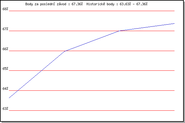 Závod| Body | Výkonnost | Změna | 15.05.2013 | Pisárky Anthropos, 6 km | 63.63% | 63.62% | | 05.06.2013 | Líšeň, 11 km | 65.97% | 65.26% | +1.64% | 12.06.2013 | Popůvky, 7.3 km | 66.99% | 66.32% | +1.06% | 19.06.2013 | Pisárky Anthropos, 6 km | 67.36% | 66.91% | +0.59% | | |