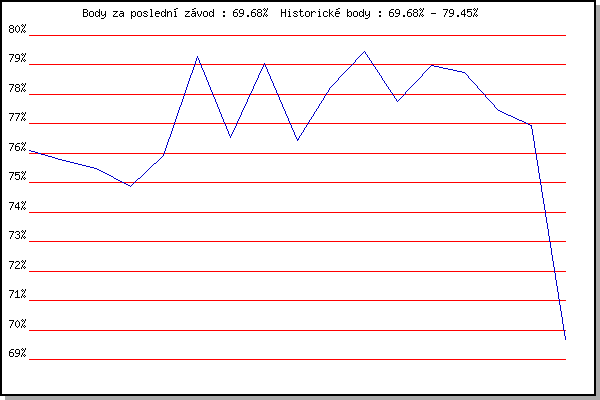 ZávodBodyVýkonnostZměna| 15.05.2013 | Pisárky Anthropos, 6 km | 76.10% | 76.10% | | | 22.05.2013 | Palackého vrch, 7.1 km | 75.74% | 75.94% | -0.16% | | 29.05.2013 | Obřany, 8.8 km | 75.48% | 75.79% | -0.15% | | 05.06.2013 | Líšeň, 11 km | 74.88% | 75.58% | -0.21% | | 19.06.2013 | Pisárky Anthropos, 6 km | 75.94% | 75.76% | +0.18% | | 26.06.2013 | Palackého vrch – Běh Olympijského dne | 79.27% | 77.01% | +1.25% | | 03.07.2013 | Obřany, 8.8 km | 76.53% | 76.95% | -0.06% | | 10.07.2013 | Popůvky, 7.3 km | 79.06% | 77.67% | +0.72% | | 17.07.2013 | Atletický stadión Pod Palackého vrche | 76.44% | 77.43% | -0.24% | | 07.08.2013 | Obřany, 8.8 km | 78.22% | 77.73% | +0.30% | | 21.08.2013 | Líšeň, 11 km | 79.45% | 78.29% | +0.56% | | 28.08.2013 | Popůvky, 7.3 km | 77.77% | 78.25% | -0.04% | | 04.09.2013 | Atletický stadión Pod Palackého vrche | 78.98% | 78.54% | +0.29% | | 11.09.2013 | Líšeň, 11 km | 78.73% | 78.69% | +0.15% | | 18.09.2013 | Pisárky Anthropos, 6 km | 77.44% | 78.44% | -0.25% | | 28.09.2013 | Blažovice – Svatováclavský běh, 11 km | 76.93% | 78.15% | -0.29% | | 28.09.2014 | Blažovice – Svatováclavský běh, 11 km | 69.68% | 77.76% | -0.39% | | | | |