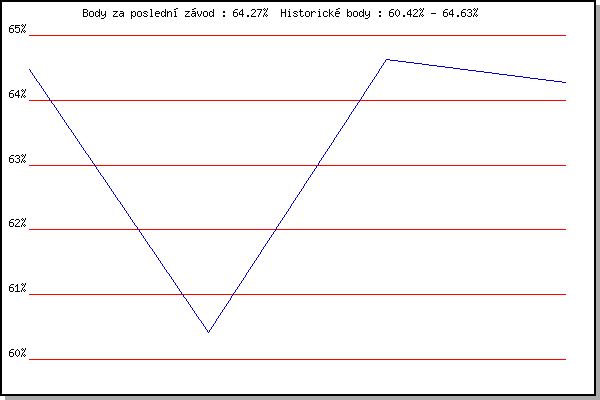 Závod| Body | Výkonnost | Změna | 09.08.2006 | Palackého vrch, 9 km | 64.47% | 64.47% | | 23.08.2006 | Líšeň Mariánské údolí, 11.1 km | 60.42% | 62.71% | -1.76% | 16.05.2007 | Pisárky Anthropos, 6.6 km | 64.63% | 63.92% | +1.21% | 23.05.2007 | Obřany, 8.8 km | 64.27% | 64.36% | +0.44% | | |