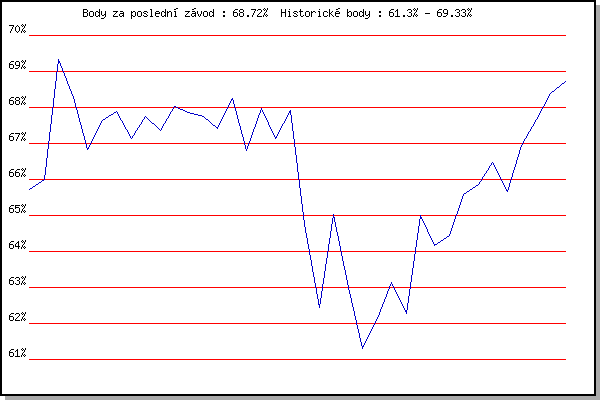 ZávodBodyVýkonnostZměna| 15.05.2013 | Pisárky Anthropos, 6 km | 65.72% | 65.72% | | | 22.05.2013 | Palackého vrch, 7.1 km | 66.01% | 65.92% | +0.20% | | 29.05.2013 | Obřany, 8.8 km | 69.33% | 67.71% | +1.79% | | 05.06.2013 | Líšeň, 11 km | 68.29% | 68.11% | +0.40% | | 12.06.2013 | Popůvky, 7.3 km | 66.83% | 67.79% | -0.32% | | 19.06.2013 | Pisárky Anthropos, 6 km | 67.63% | 67.86% | +0.07% | | 26.06.2013 | Palackého vrch – Běh Olympijského dne | 67.90% | 67.94% | +0.08% | | 03.07.2013 | Obřany, 8.8 km | 67.15% | 67.76% | -0.18% | | 10.07.2013 | Popůvky, 7.3 km | 67.75% | 67.81% | +0.05% | | 17.07.2013 | Atletický stadión Pod Palackého vrche | 67.37% | 67.72% | -0.09% | | 24.07.2013 | Pisárky Anthropos, 6 km | 68.03% | 67.84% | +0.12% | | 31.07.2013 | Palackého vrch, 7.1 km | 67.85% | 67.87% | +0.03% | | 07.08.2013 | Obřany, 8.8 km | 67.76% | 67.87% | 0.00% | | 14.08.2013 | Atletický stadión Pod Palackého vrche | 67.41% | 67.77% | -0.10% | | 21.08.2013 | Líšeň, 11 km | 68.25% | 67.92% | +0.15% | | 28.08.2013 | Popůvky, 7.3 km | 66.80% | 67.77% | -0.15% | | 11.09.2013 | Líšeň, 11 km | 67.96% | 67.87% | +0.10% | | 18.09.2013 | Pisárky Anthropos, 6 km | 67.13% | 67.71% | -0.16% | | 28.09.2013 | Blažovice – Svatováclavský běh, 11 km | 67.92% | 67.79% | +0.08% | | 14.05.2014 | Pisárky Anthropos, 6 km | 64.75% | 67.61% | -0.18% | | 21.05.2014 | Palackého vrch, 7.1 km | 62.44% | 67.04% | -0.57% | | 28.05.2014 | Obřany, 8.8 km | 65.04% | 66.66% | -0.38% | | 04.06.2014 | Líšeň, 11 km | 62.99% | 66.00% | -0.66% | | 18.06.2014 | Pisárky Anthropos, 6 km | 61.30% | 65.34% | -0.66% | | 25.06.2014 | Palackého vrch – Běh Olympijského dne | 62.15% | 64.71% | -0.63% | | 02.07.2014 | Obřany, 8.8 km | 63.15% | 64.45% | -0.26% | | 09.07.2014 | Popůvky, 7.9 km | 62.27% | 64.02% | -0.43% | | 16.07.2014 | Atletický stadión Pod Palackého vrche | 65.01% | 64.37% | +0.35% | | 23.07.2014 | Pisárky Anthropos, 6 km | 64.16% | 64.41% | +0.04% | | 30.07.2014 | Palackého vrch, 7.1 km | 64.45% | 64.53% | +0.12% | | 06.08.2014 | Obřany, 8.8 km | 65.57% | 64.89% | +0.36% | | 13.08.2014 | Atletický stadión Pod Palackého vrche | 65.86% | 65.23% | +0.34% | | 20.08.2014 | Líšeň, 11 km | 66.46% | 65.63% | +0.40% | | 27.08.2014 | Popůvky, 5.3 km | 65.68% | 65.72% | +0.09% | | 03.09.2014 | Atletický stadión Pod Palackého vrche | 66.93% | 66.09% | +0.37% | | 17.09.2014 | Pisárky Anthropos, 6 km | 67.66% | 66.56% | +0.47% | | 02.09.2015 | Atletický stadión Pod Palackého vrche | 68.39% | 67.09% | +0.53% | | 28.09.2015 | Blažovice – Svatováclavský běh, 11 km | 68.72% | 67.58% | +0.49% | | | | |
