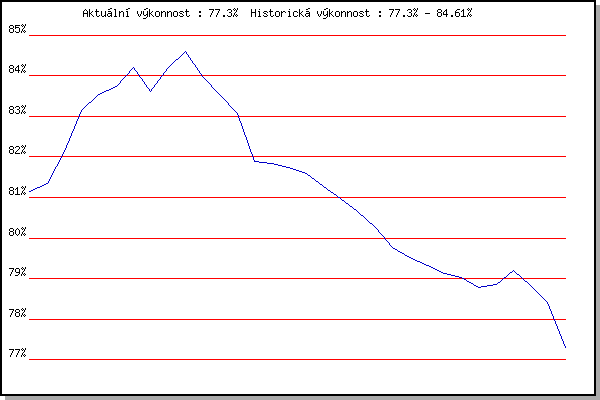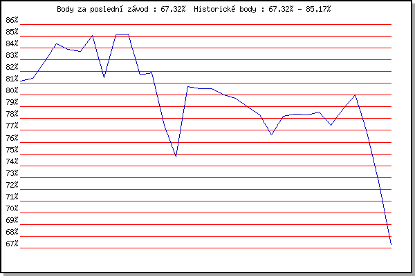ZávodBodyVýkonnostZměna| 22.05.2013 | Palackého vrch, 7.1 km | 81.16% | 81.16% | | | 29.05.2013 | Obřany, 8.8 km | 81.41% | 81.34% | +0.18% | | 05.06.2013 | Líšeň, 11 km | 82.85% | 82.13% | +0.79% | | 12.06.2013 | Popůvky, 7.3 km | 84.35% | 83.15% | +1.02% | | 19.06.2013 | Pisárky Anthropos, 6 km | 83.86% | 83.54% | +0.39% | | 24.07.2013 | Pisárky Anthropos, 6 km | 83.68% | 83.73% | +0.19% | | 07.08.2013 | Obřany, 8.8 km | 85.04% | 84.20% | +0.47% | | 14.08.2013 | Atletický stadión Pod Palackého vrche | 81.50% | 83.62% | -0.58% | | 21.08.2013 | Líšeň, 11 km | 85.14% | 84.18% | +0.56% | | 04.09.2013 | Atletický stadión Pod Palackého vrche | 85.17% | 84.61% | +0.43% | | 11.09.2013 | Líšeň, 11 km | 81.70% | 83.98% | -0.63% | | 18.09.2013 | Pisárky Anthropos, 6 km | 81.90% | 83.55% | -0.43% | | 17.09.2014 | Pisárky Anthropos, 6 km | 77.43% | 83.07% | -0.48% | | 28.09.2014 | Blažovice – Svatováclavský běh, 11 km | 74.73% | 81.90% | -1.17% | | 13.05.2015 | Pisárky Anthropos, 6 km | 80.71% | 81.84% | -0.06% | | 20.05.2015 | Palackého vrch, 7.1 km | 80.53% | 81.73% | -0.11% | | 27.05.2015 | Obřany, 8.8 km | 80.57% | 81.60% | -0.13% | | 10.06.2015 | Popůvky, 7.9 km | 79.99% | 81.28% | -0.32% | | 17.06.2015 | Pisárky Anthropos, 6 km | 79.73% | 80.98% | -0.30% | | 24.06.2015 | Palackého vrch, 7.1 km | 79.04% | 80.65% | -0.33% | | 01.07.2015 | Obřany, 8.8 km | 78.31% | 80.26% | -0.39% | | 15.07.2015 | Atletický stadión Pod Palackého vrche | 76.63% | 79.77% | -0.49% | | 29.07.2015 | Palackého vrch, 7.1 km | 78.22% | 79.52% | -0.25% | | 05.08.2015 | Obřany, 8.8 km | 78.40% | 79.32% | -0.20% | | 12.08.2015 | Atletický stadión Pod Palackého vrche | 78.30% | 79.12% | -0.20% | | 26.08.2015 | Popůvky, 7.9 km | 78.55% | 79.02% | -0.10% | | 02.09.2015 | Atletický stadión Pod Palackého vrche | 77.41% | 78.78% | -0.24% | | 09.09.2015 | Líšeň, 11 km | 78.83% | 78.85% | +0.07% | | 16.09.2015 | Pisárky Anthropos, 6 km | 80.00% | 79.20% | +0.35% | | 28.09.2015 | Blažovice – Svatováclavský běh, 11 km | 76.88% | 78.83% | -0.37% | | 03.08.2016 | Obřany, 8.8 km | 72.64% | 78.42% | -0.41% | | 25.04.2018 | Atletický stadión Pod Palackého vrche | 67.32% | 77.30% | -1.12% | | | | |